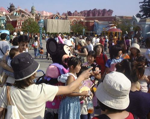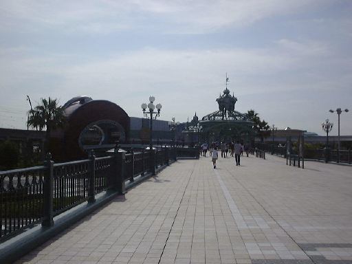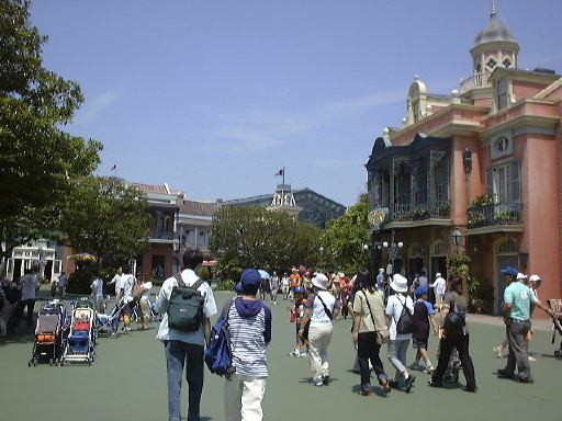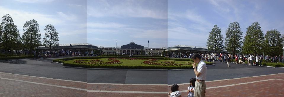 時間が経つうちに一般の自動車も駐車場に増え出して、外には人がうろうろし始めました。目立つのは家族連れですね。みんなこんな早くからよう来るな、と思いましたが、自分の方がもっと早くに来てるわけだから文句は言えません(笑)。そんなこんなで数時間経過。8時を回ったところでようやく乗務員さんからパスポートが配られました。そして諸注意を聞いて解散。帰りは閉園10分後出発予定とのことでした。さて、パスポートも受け取ったことですし、バスから出てディズニーランドの入り口へと歩いていきました。ゲートの前にはすでに人が溢れています。メインゲート前をつなげてポン。日曜日とはいえ、開園前からこの人の多さ、宝塚●ァミリーランドとは比べ物になりませんね(比べてはいけません)。天気は上々どころか快晴で、日ざしが強い夏らしい朝です。そんな暑い中どんどんメインゲートの方に集まってくる人たちの流れに逆らって、TAKUさんとの待ち合わせ場所である舞浜の駅に向かって歩きました。今回のオフ企画はTAKUさんの手によるものなのです。