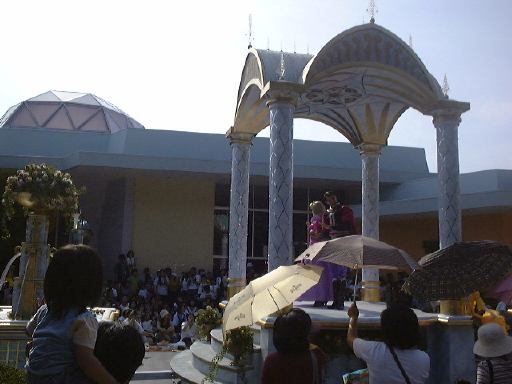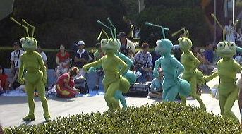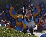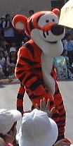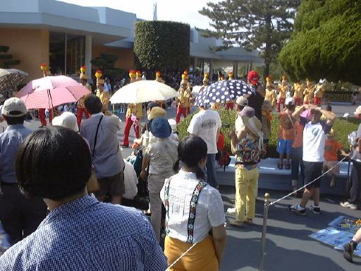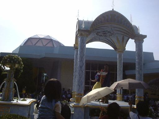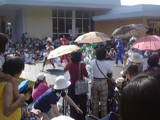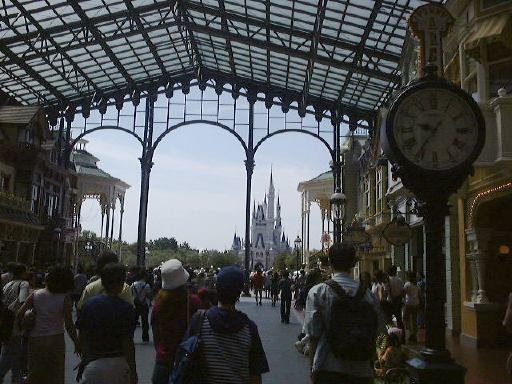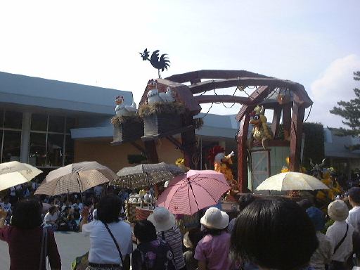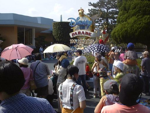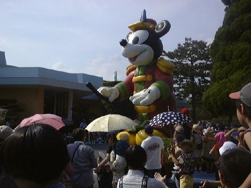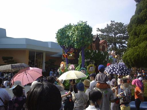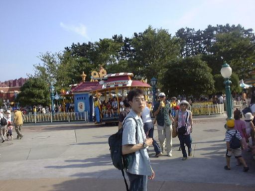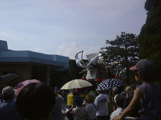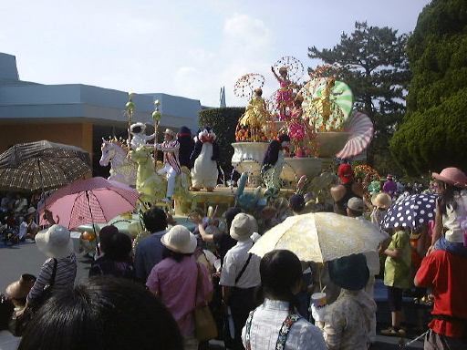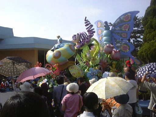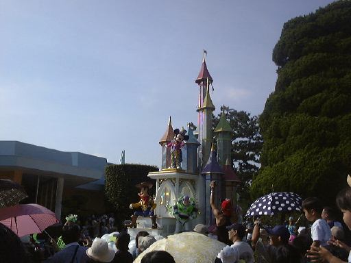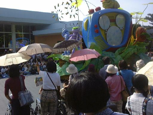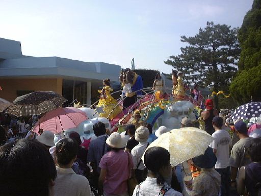 えっと、前に人がいたためあまり上手く撮れていませんが、夢中で写真をばんばん撮りましたのでその中から選りすぐって全部ご紹介(全部か!)。まずはリボンを振る赤い男の人、その後ろに先頭の100周年記念山車(?)、続く音楽隊、おっきい昔風味のミッキー・マウス、ビーバーが操るパラパラマンガつき山車、その周りにいるこんな人やこんな人、そしてこんな人に導かれてやってきたのが、三匹の子豚号(勝手に命名)、後ろの方にはオオカミも、さらにこんな人やこんな人の次にやってきたのが「チキン・ラン」でしょうか(絶対違う)、あとこんなポーズを決める人もいたりして、ダンスグループがいて、王子様&お姫様シリーズ(シンデレラ、眠れる森の美女、白雪姫かな)が続き、その後ろにも踊る人たち、それに続くのが、えっと「ピングーと愉快な仲間たち」ですか(<投げやりになってないか?)、周りにいるのは役に立ちそうにない傘を持っているこんな人、そしてやってきましたロジャーラビットのカウンターバー(断っておきますが正式名称は一切知りませんよ<今さら)、ローラースケートで笑顔を振りまく(笑顔しかないのですが)ティガー、まだまだ続いて、傘が邪魔で良く判りませんが前は車椅子用の観覧席だったのであしからずのこんな人たち、で現れたのが良い意味でお山の大将気分(<どんな気分だ)の不思議の国のアリス、竹馬に乗ってるっぽいこんな人が過ぎたあとは、ちょっとセクシィなアリの人たち、その後ろからはたぶんアント号、そしてまたまた竹馬に乗ってるっぽいこんな人が通り過ぎ、やってきたのが美女と野獣、そんでもってトリを務めるのはやっぱりこの人ミッキー・マウス、近くにくるとこんな感じ(まだ遠いけど)、最後尾には棒を持ったお姉さんがいて、その後ろからはぞろぞろとお客さんがデモ行進のようについていってましたけど、あれはどうかと思います。観てる方も演じてる方も汗だくになる過酷な環境でしたが、主人公が変わるときはちゃんと音楽もそれに合わせて変わるし、そのエンターテインメント性に胸を打たれましたね。そうそう、パレードが始まる前はちゃんと前座のような人がいて、手拍子させたりしながらお客さんのテンションを上げていくのも、さすがだなあと思うところですね。人が創っているという感じがします。そう言えば、パーク内はとても綺麗でゴミくずを見かけることはほとんどありません。1分に1回は掃除係の人と出くわすと言っても過言でないくらい、そういうサービス面も行き届いていますね。感心感心(偉そうに)。