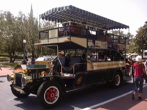朝からすごい人の数です。それでも少ない方だというんだからさらに驚き。ゲートを通ってまっすぐ飲食店やショップが並んでいる「ワールド・バザール」をぞろぞろと歩きます。この日はちょうど七夕週間の最終日で交差点には大きな笹が飾られていて、その下の方には短冊を結びつけるための柱というのか掘建て小屋みたいなのが交差点の中央と四隅に設置されています。趣としてはおみくじか絵馬が結び付けられているような感じ。そうそう、その短冊の形が実はミッキー・マウスの顔の形をしていて、だから正確に言うと「短冊」ではありません(笑)。とりあえず願いごとを書くのは後回しにして「ワールド・バザール」を通り抜けていくと、正面にはシンデレラ城が見えてきます。ずんずん進んでお城正面の庭のようなところにはオムニバスという2階建てバスがいて、お客さんを乗せているところでした。
