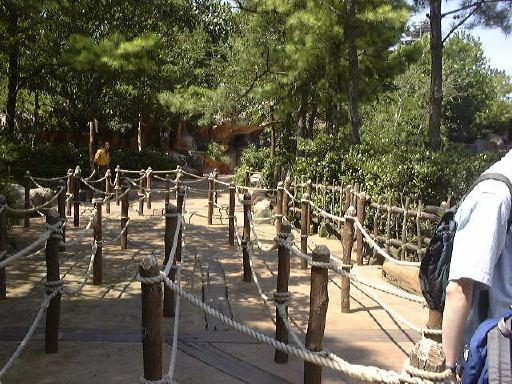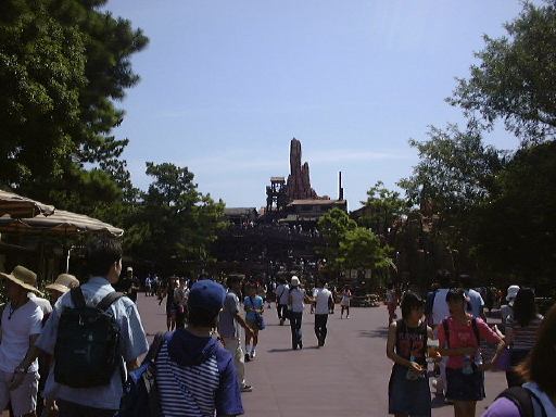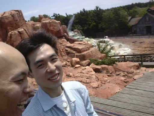 さて、「ビッグサンダー・マウンテン」に乗れるまではまだ時間があったので、今度はアドベンチャーランドまで行き、「カリブの海賊」を体験することになりました(そこへ向かうところ)。15分くらいの待ち時間でボートに。あ、ネタばれになるのであまり詳しくは書きませんけど、どこからともなく語りかけてくる声の主が、アトラクションの最中は散々「呪われても知らなねぇぞ」みたいな悪態をついてくるのですが、それが帰り際のエスカレータの降り場では、丁寧にも「足下には気をつけてくれよな」と言ってくるのが可笑しかったですね(笑)。その後、いよいよ「ビッグサンダー・マウンテン」に乗ることができました。ファストパス側の列なので、普通に並んでいる人たちを尻目にすいすい進んであっという間に乗車。う〜ん、久しぶりのジェットコースタに気持ちが高揚しています。思わず頂上付近で撮った写真がこれ(笑)。あんまり走行中に撮る人はいないでしょう。面白いと思ったのは登りが何段階かあるというところですね。それからどうも乗り場が2箇所あるように思えたのですが、気のせいだったのでしょうか。