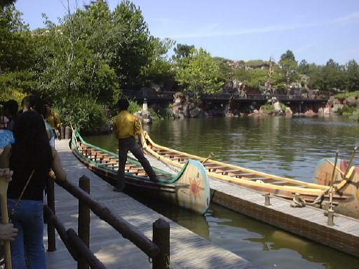次に向かったのはウエスタンランドで、このように人はまばらだったのですが、「ビッグサンダー・マウンテン」には結構な列ができていてすぐに乗れそうもなかったので、とりあえずここはファストパスという予約券みたいなものをゲットしておくにとどめました。それから時間を埋めるために何かないかとクリッターカントリーに足を伸ばしました。しかし、こんな暑い日にうってつけの「スプラッシュ・マウンテン」は改装工事のためお休み。で、その近くにある「ビーバーブラザーズのカヌー探検」が2番目のアトラクションとなりました。人気がないのか朝だからなのか、乗り場に行ってみると列になることもなくこんなふうに空き空き。すぐにカヌーに乗ることができました。乗り場はこんな感じ。カヌーの前と後ろに同乗するお兄さんたち(とくに前方のお兄さん)が元気です。手に持つやつ(パドルだったっけ?)の持ち方やこぎ方の説明から、イチ・ニッ・イチ・ニッのかけ声まで隙のないサービスです。たまに入るギャグは隙だらけですが、一緒に乗っていた女の子グループが負けずに元気だったので、なかなか楽し気でしたね(笑)。こいだり休んだりしながらアメリカ河をぐるっと一周。誰も落ちることなく無事戻って来れました。こういう自分の身体を使ったアトラクションがわりと好みかもしれません(最初だからかも)。