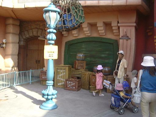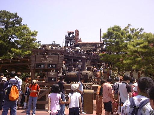 さらにシンデレラ城の向かって右側を通ってファンタジーランドの方へ行くと長蛇の列ができています。ずうっと先に行ってみるとそれが「プーさんのハニーハント」に並んでいる列だということが判りました。すでに3時間待ちくらいだったと思います(うひゃあ)。噂には聞いていましたがそれにしてもえらい人気ぶりですね。ということでそれは諦め、すぐ入れそうなところは・・と探して辿り着いたのが、「イッツ・ア・スモールワールド」でした(にっこり)。初アトラクションがここです。それはどうなんだろう、という話もありましたが、とにかくここが初めてのTDL体験となりました。えっと、実際入ってみての感想ですが、「ああなるほど、これがディズニーランドか」という印象でしたね。とくに何のびっくりもなく、ボートに乗って流れに身を任せ、音楽が流れる中を平和的に進んで行くだけですが、なんというのでしょう、ある地域では音楽にその地域の特徴的なアレンジが施され、それが違和感なく次の地域へとつながっていって、最後には出てきた全ての民族が一緒になって「イッツ・ア・スモールワールド」を大合唱という流れ、まさに世界が凝縮されているというイメージが見事に再現されています(ほめ過ぎか)。ある意味アメリカ的な思想がありありですが、ディズニーだから当然と言えば当然でしょうか。良い意味で最後が近づくに連れてだんだんと洗脳されていく感覚です(良い意味か?)。人形の動きも細かいところまで凝っていて、う〜ん世界はひとつだなあ、なんてほんのり感動風味のアトラクションでした。そうそう、提供がそごうだったんですが、大丈夫なんでしょうか。言うまでもなく、そこを後にしてからもずっと頭の中には「イッツ・ア・スモールワールド」がエンドレスです(笑)。