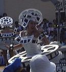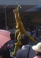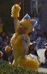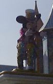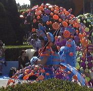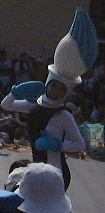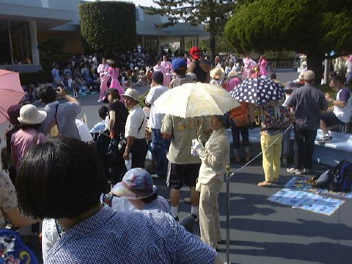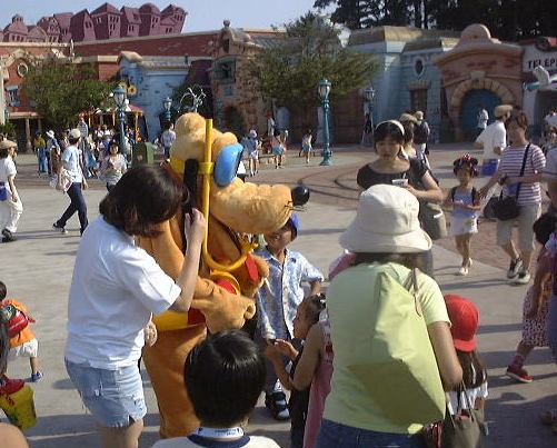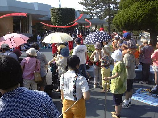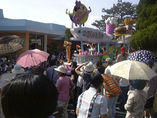 このあたりで午後3時前だったでしょうか。太陽は容赦なく照りつけてますます暑くなってきました。そして道行く人はみんなミッキーアイス(正式名称知らず)やらかき氷(シェイプアイス)などを食べています。こうなったら食べたくなるというのが人情。かき氷を探し求めてうろうろしました。そして「スタージェット」(これには乗りませんでした)の下で売られているのを発見。さっそく並んで買いました。こずえさんはハニ−プリン、TAKUさんはハニ−ストロベリー(シェイプアイス)の大で、なんと容器がプーさんの顔の形をしているのです(しかも透明)。私はレギュラのハニーレモン(シェイプアイス)で、な〜んの変哲もない入れ物でしたね。TAKUさんのを見て少し後悔(苦笑)。それから涼みながら食べられる場所を探したのですが、パレードの時間が近いということもあって、日陰にはことごとく人が陣取っています。結局日が当たるベンチでかき氷などを食べることになりました。かき氷は冷たくて頭が痛くなるほどにもかかわらず、身体の外側は太陽のせいで熱くなっていくのです。なんだか極寒地獄と灼熱地獄を同時に味わっている感じ。氷を食べて汗をかくんですから、トータルの水分量としてはちょうど良いのかもしれませが、暑さは絶好調です(ふぅふぅ)。