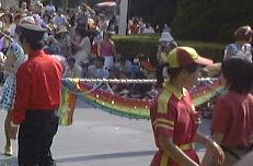 そんなおやつを食べ終わった頃、いよいよディズニーランドのテーマ音楽が流れ始め、昼のパレードが目の前までせまってきました。先頭に見えてきたのはこの人たちです。って手前で立っている人たちではありませんよ(笑)。奥に小さく写っている赤い人たちです。暑い中笑顔を絶やさず踊っています。さすがプロ。ちなみに100周年記念バージョンのパレードのようでしたが初めてなので違いはよくわかりません。