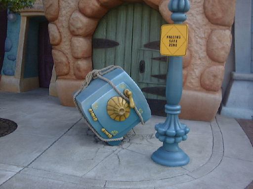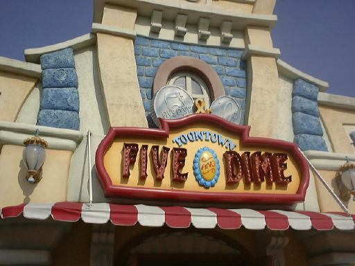 パレードが終わった後は、青空に映えるシンデレラ城を眺めつつ移動。で、向かったのはロジャーラビットでお馴染みのトゥーンタウンです。「ミッキーの家」や「ミニーの家」があるところですね。街の中にはぐるっと「ジョリートロリー」が走っていて、サンフランシスコのケーブルカーを彷佛とさせます。そのトロリーをバックに振り返るTAKUさん。そして人だかりができていると思ったらこの人でした。それにこの人も大人気。乗り物系のアトラクションとして「ロジャーラビットのカートゥーンスピン」があったようですが、これは残念ながら改装中でお休み、他に「ガジェットのゴーコースター」というミニコースターもありましたが、これはちょっと人が並んでいたので諦めました。でも、街の中にはいろんなギミックが施されていて、フタを開けると効果音が出る箱とか、部屋から飛び出してきた鉄球、落ちてきた巨大な金庫などなど、楽しめる要素が盛り沢山の街です。あとところどころで停まっているディズニーキャラクタの自動車が、ことごとくタイヤがパンクしたように作ってあるのが面白い。こういうのがわりと好きだったりします(笑)。それから、こんな看板(これは普通)のショップでお土産を見たり、とりあえず「チップとディールのツリーハウス」に入ってみたりして、トゥーンタウンを後にしました。