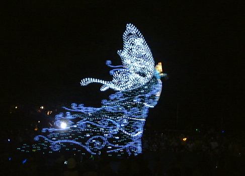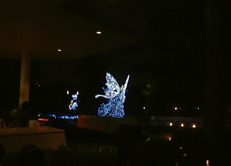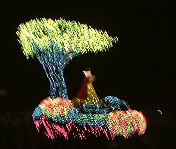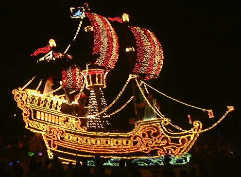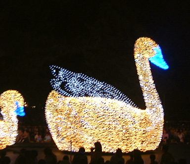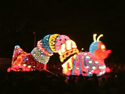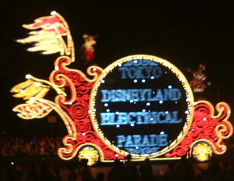 さて、残った男二人組(しかもペアルックだ)ですが、夜のパレードが始まる前に夕食を済ませようということで、トゥモローランドにあるでっかいハンバーガーレストランでハンバーガーなどを食べました。で、食べ終わった7時半頃、新しくなったらしい「エレクトリカルパレード・ドリームライツ」が始まり、そのレストランをの出てすぐのところで見学することに。昼よりも圧倒的に観客の数が多いです。陣取りをしていないとどうしても後方からの見学になってしまいます。それでも、いざ光り輝くパレードを目前にすると夢心地になってしまいましたね。本当に綺麗なんだもの(似合わないこと言ってます)。とにかく感動です。こんなの見せられたらイチコロだよ〜(<何が?)と思えてきます。ぶれてるものもありますが、以下にデジカメのバッテリィが続く限り撮ったパレードの様子を。まずは先頭が近づいて来るところ。そして正面に(シンデレラかな)。後ろに続くのはグーフィーが運転する機関車で、後ろの車両に乗っているのはミッキー・マウスとミニ−・マウスです。そして全身のライトが一瞬消えた瞬間を捕らえたアリスの猫バス(<バスじゃありません)、さらにてんとう虫や尺取り虫、フック船長が乗った海賊船に、木の下に佇む白雪姫、ラスト近くの白鳥親子などなど、もちろん実際にはもっと沢山のキャラクターがパレードを繰り広げました。それで、最後の曲が「イッツ・ア・スモールワールド」だったのが印象的でした。まさに「イッツ・ア・スモールワールド」に始まって「イッツ・ア・スモールワールド」に終わる、と言えますね。やっぱりディズニーランドの全てはこの中に凝縮されているんだなあ、と勝手に解釈して改めて感動したしだい(笑)。