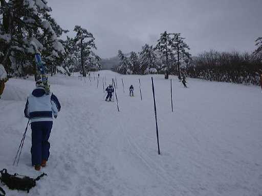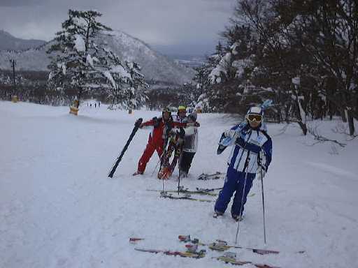 (2/27) 日付けが変わって、まだバスの中です。最近午前4時ぐらいに寝るのが当たり前になっていたせいか、シートの座り心地がいまいちなせいか、寝つきがよくありません。しかたなく読書の続きをしたり音楽を聴いたり(だから眠れないのか)。途中、中国道路の加西サービスエリアで休憩。米子駅に到着したのは午前4時半。この少し前車内でおしぼりが配られたのですが、目を覚ますためでしょうか(全然眠れなかったんですけど)。というか、4時半に降ろされて寒いし暗いし、どうしろというのでしょうか(文句ばかり)。駅構内にも入れないし、それでもバスの待合所くらいは開いているかなと思っていたら、これも開いてないし、雪は降ってくるしで散々です。仕方がないのでコンビニを探して歩き回ってローソンを発見(発見の旅か)。さすがはローソン偉い偉い。これからはローソンだな、うん(勝手に納得)。しばらく寒さを忍んだあと、朝食を買って再び米子駅へ。途中横断歩道の手前にこんなものを発見。律儀な市民性を反映しているのでしょうか。この頃には一応駅は開いていて、ベンチに座ってご飯を食べて読書です(笑)。面白いのでどんどん読んでしまうのです。目的の大山行きのバスは始発が7時。それまではずっと読書でした。そして午前7時、いよいよ目的地の大山へ向けて出発です。約1時間の道のり。朝一のバスなのに途中からどんどん人が乗ってきて、あっという間に満員です。たぶん大山で働いている人たちなのでしょう(子供もいたけど気にしない)。午前8時頃、大山に到着。早速後輩達が宿泊している宿に行って、宿の人にH大スキー部のOBだということを伝えます。電話で後輩を呼び出し、部屋に上がらせてもらいました。休む間もなく着替えその他準備して、大山国際スキー場へ向かいました。朝から雲行きが怪しい感じです(文字どおりの意味)。9時過ぎ、スキー場の中腹にあるロッヂ大山で集合。10時少し前までフリーで何本か滑った後、ポールセッティングです(競技スキー部ですから)。かなりスキーが上手い2年生のT口君が立てたのは、GS(ジャイアントスラローム)のセッティングでした(分らない人は気にしないこと)。セッティングの様子がこれ。本来この日は、OBと現役がタイムを競う中枝杯の予定だったのですが、来たOBは私一人という有り様(苦笑)。競技どころではないので午前中はポール練習ということになりました。しかし、雪の勢いは増し、風も強くなって、前が見えないくらいの吹雪きです。顔が痛くてたまりません。こんな天気じゃ誰も来たがらないだろうなと思いましたね。お昼、ロッヂ大山で休憩をしようとしたら、予想どおりすごい人(数がね)。日曜日ですからね。仕方なく方々に散って昼食を済ませ、しばらく休息。ここで気付いたのですが、デジカメをポケットに入れたまま滑っていたせいか、いつの間にやら一部が凹んでいたのです。撮影には支障はないみたいですが、なんだかねぇ・・(溜息)。さらに腕時計もベルトが割れていたのです(プラスチックなので)。またまたショック。はるばる名古屋からやってきて何をやってるんだろと5秒ほど思いましたが、午後は天気も回復し、晴れ間も見えてきました。こうなったら、がぜんやる気が出てきます(笑)。1時半頃から開始した午後の部では、やっぱり中枝杯をしようということになり、スラロームのポールセットにして、デュアルレース方式の個人戦のトーナメントをすることになりました。キャプテンのF田君が立てたポールセットでのレースはこんな感じです(本来はこんなまっすぐじゃないですよ、念のため)。別れを惜しみつつあっさりと(笑)途中で帰ったので結果がどうなったのか分りませんが、楽しかったです。みんなありがとう。これが可愛い後輩達の一部だ!