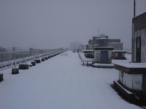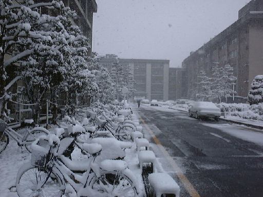 朝ですが書きましょう。昨夜帰ろうと外に出たら予想以上に雪が降っていました(笑)。そして今朝、起きたらこれまた予想以上に雪が降っていて結構な積雪。普段はカラフルな街並もすっかりモノトーンです。雪が積もると風景が全然違って見えますね。今日は歩いて9時頃大学へ来ました。見なれた大学構内も真っ白で新鮮な感じです。妙に浮かれて、朝早くから写真を撮ってしまいました。まず、埋もれそうな自転車置き場。それから屋上とそこから見下ろした箱庭のような一枚。デジカメの性能の限界でしょうか、もっと雪が激しく降っていたのですがいまいち写真に映りませんね。なんて浮かれてる場合でもありません。そう言えば、今日と明日は卒業論文の発表会だったのです(忘れてた)。全部聞く必要はありませんが、自分とこの卒論生の発表ぐらいは聞かないとね。しかし、雪で交通機関が乱れているようなので、まだ来られてない先生方もおられるんじゃないでしょうか。まあ、どっちでも良いんですけど(笑)。都会の雪は中途半端に積もるのでいやですね(話が飛ぶ)。積もるならしっかり積もってベチョベチョにならないで欲しいです。足下がすぐ濡れるのが困ります。雪国だったらあまり濡れることはありませんからね。と文句を言いながら朝から写真を撮り回ったりしてるあたり、雪が好きなんだと思います(笑)。