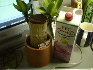 昼食後、さっそく工学部の事務に行って授業の確認してきました。放射線化学の講議はどうやら後期にあるようです。すぐに受けなくてよかったのでほっとしましたが、後期は後期で忙しいですからねぇ・・。というより、後期に受けて間に合うのかという問題がありますね(しかし気にせず)。その後地化図のことで学生代表3人とM村先生でまとめのディスカッション。だいたいどういう方針で行くか、あと何が必要かということを確認。仕事が少し増えました(涙)。それから中性子放射化分析のデータ解析を少し。これは古いパソコン(MS-DOS)を使ってのなかなか手間のかかる作業なんですが、ようやく慣れてきて、見通しが立ってきました。来週のコロキウムには間に合わせたいところ。そうそう、夕方頃、またまた面接でこの地方にやってきたぷりを氏が大学に来て、前回貸していた傘を返してもらいました。お土産にパイロゲン(今度は900ml!)と幸福の木をいただきました(わーい)。お見せしましょう。これが噂のパイロゲンだ!(幸福の木とともに)