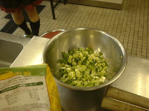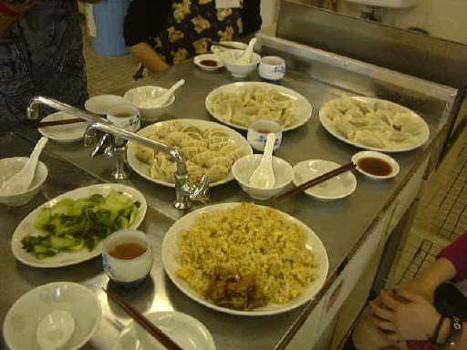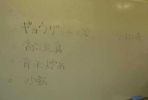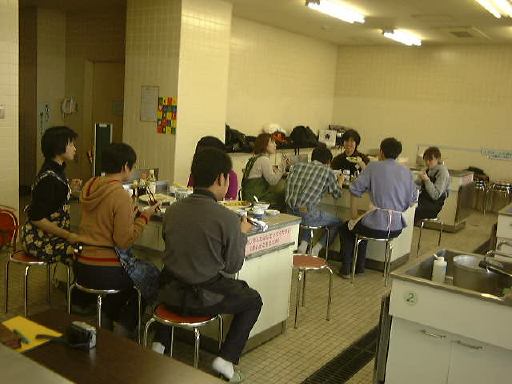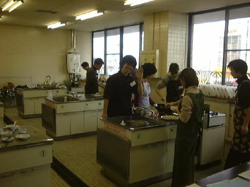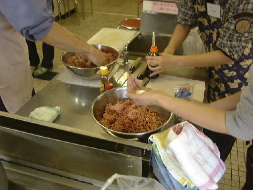 しばらくして、AkiraさんとAなあなさんが到着。10時を回った頃、まだ全員は揃っていませんでしたが(連絡はありです)名刺交換もそこそこに、とりあえず材料のリストアップが始まりました。基本は普通のひき肉を使った焼餃子と水餃子、それにチャーハンと箸休めのチンゲンサイを炒めることになりました。あと、デザートにはアンニン豆腐です(これは作らず)。具体的な材料はこれとかこれ。そのうちにRいはちさんが来られ、Freeさんもやがて登場。ちなみに調味料の一部はAなあなさんが持参です。それから買い出し班と料理室の準備班に分かれそれぞれ別行動。私は買い出し班として外へ出て行きました。メンバはKつさんとFreeさんとAなあなさん。まず向かったのは5分ほど歩いたところにあるお肉屋さん、その名も「肉の横関」です。ここのひき肉はなんと100gで50円という安さ。驚きです(相場は知りませんけど、1食200g食べても1日300円で済むのか、という計算をして驚き)。その後はセンターのすぐそば、地下にあるスーパー「主婦の店」でその他の材料を買い込みました。お米は2kgからしか売っていなかったので1kgのをコンビニで購入。料理室に戻ると、調理台の準備は整っていました。そしてLadyLeeさんも到着されていた模様。これで10人全員が揃い、いよいよ料理開始です。