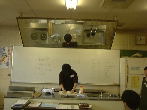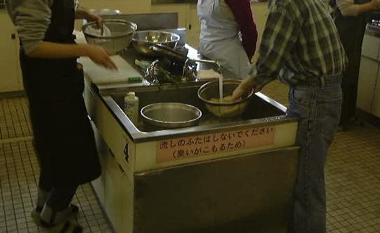 地下鉄の東山線と鶴舞線を乗り継ぎ浄心駅に到着したのが9時50分くらいでした(思ったよりは近かった)。とりあえず安堵の溜息をつき息を整えつつ会場へ向かいました。地下鉄の出口を出てそのまま直進、左手に店鋪が並んでいて、奥へ少し入ったところが入口です。建物の2階が受付のあるロビィになっています(ってこの文章は幹事のKずえさんの案内からの転載だったりします)。施設の利用予定のところにはちゃんと「那古野コネクション」と書いてあります(笑)。奥へ進んで料理室へ入るとKずえさん、Kつさん、MつるさんとS田天治さんがすでに来られていました。挨拶を交わしながら奥へ入ろうとすると、「スリッパに履き替えなくちゃダメ!」とのことでした(脚色あり)。良く考えたら当たり前ですね、土足であんまり料理はしません。ここでKつさんが「ここでスリッパに履き替えてください」と書かれた看板を外から見えるようにセッティングされました。ってそんな細かい描写はいらないですか?(笑) そう言えば「ここではきものをかえてください」と書いてある看板を見て履物を変えるのか着物を変えるのかどっちのことか迷ってしまうというお話もありましたね(ってそんな話もどうでもいいから早く餃子へ)。