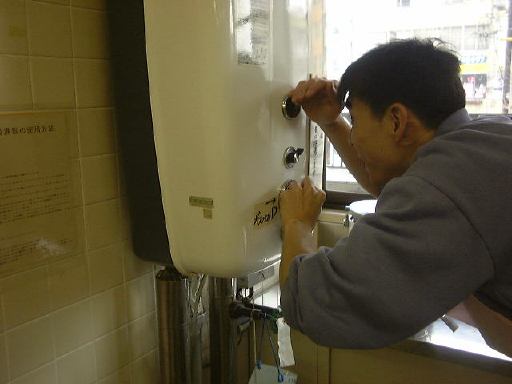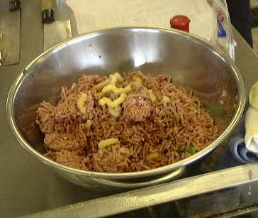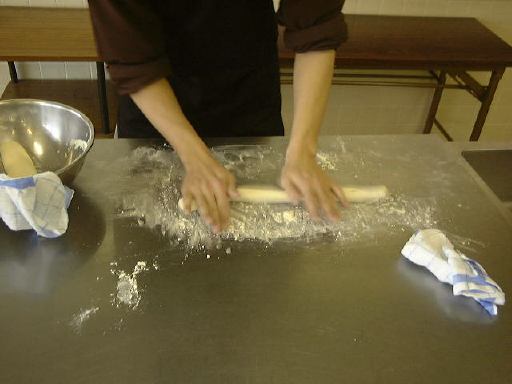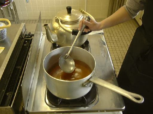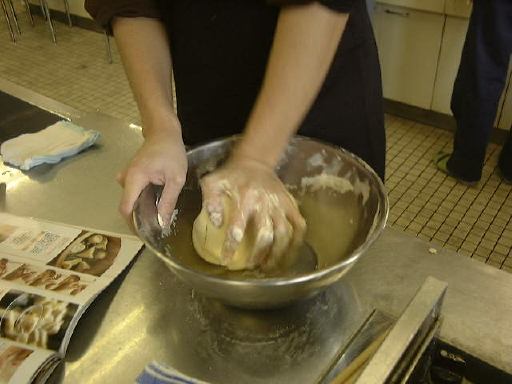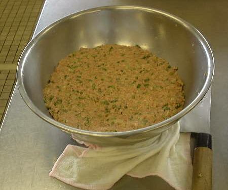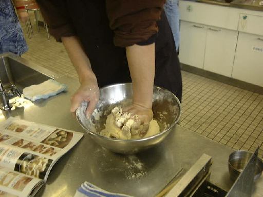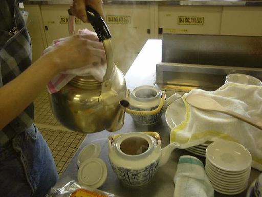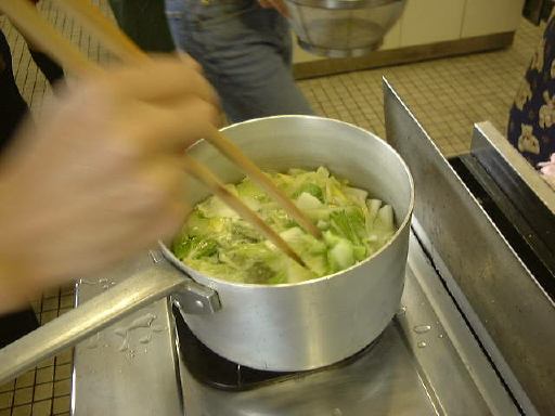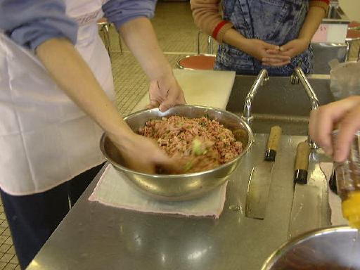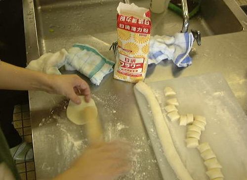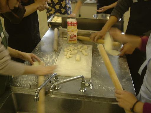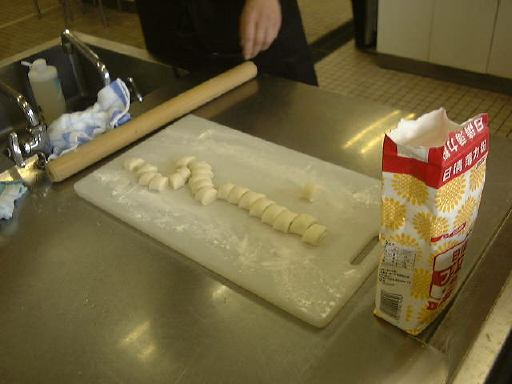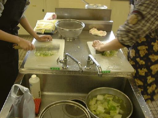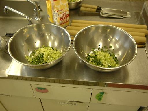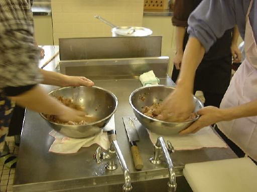 みんなそれぞれにエプロンを用意されていましたが、私はジャージです(笑)。ま、服が汚れなければいいのです。まずはお米を研いでチャーハン用のご飯を炊きます。そして餃子の皮作りが始まりです。薄力粉と強力粉と水を配合し、練ります(主にAkiraさんが)。どんどん練ります(主にAkiraさんが)。もっと練って(主に・・以下略)だんだん形になってきました。一方、もうひとつの調理台では、餃子の具の調理が始まっています。まずはニラやネギを切る作業。同時にチャーハン用のネギも切ることになり、ネギ切り合戦は激化(笑)。とこっちに気を取られているうちに、練り上がった餃子の皮の生地がこれ(この後15分くらい寝かされます)。同時に、なにげに烏龍茶用のお湯も沸かされています。などとうろうろしているお前は何をしているのだ!と言われそうですが、記録係です(笑)。さて、餃子の具の方は白菜を茹でる行程に移り、切り上がったチャーハン用のネギと餃子用のネギとかを撮っているわけですね。なんてことをしている間に、茹で上がった白菜は見事な包丁裁きによって刻まれます。すでに料理室は熱気ムンムンです。烏龍茶用の湯飲みも洗われます。次に、餃子の具の調理台では、いよいよひき肉に味付が施され、混ぜる行程に。ニンニクと生姜も混ぜられ、今度はネギとニラと白菜と肉の練り込み合戦。そして練り上がりがこれ。そうこうしている間に、温かい烏龍茶が入れられています。しかし、水道の水は冷たいということで、湯沸かし器のガスをひねる人ひとり(何か見えますか?)。