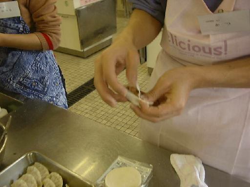具の作業が一段落したところで、皮の生地がいい頃合になっていました。いよいよ包む作業へ移るわけですが、その前に、もうひと練りして伸ばして小分けにします。その行程をすでに餃子の皮職人となったAkiraさんが前方の調理台で披露(笑)。上には鏡が備えられていて手許がこちら側からでも見えるようになっています。料理教室のようです。近寄るとこんな感じ。鏡を見るとこんな感じ。さて、ここで先ほど作っていた烏龍茶を飲んでひとまず休憩となりました。ただし、生地を伸ばし続けるAkirasさん以外ね(笑)。小休憩の後、さらにどんどん小さく伸ばして、皮一枚分に包丁で分割(バター飴みたい)。それからそれを綿棒を使って(ってそれじゃ耳掃除!)、じゃなくて麺棒を使って生地を丸く伸ばします。一方、具が出来上がった調理台では市販の餃子の皮で包む作業が始まっています(このピンクのエプロンは誰?)。包まれた餃子はこんな感じ。このように接着部には水をつけて包みます。こんな風に包んだり、あるいはこんな感じで包んだり(しつこい?)。こうやってどんどん包まれていく餃子ですが、まだまだ皮を作る作業も続いていて、皮を伸ばしている人の視線で見たオンボードカメラの映像。そして皮伸ばし作業も、皮は中を舞い、麺棒がうなりを上げる修羅場の様相を呈してまいりました(笑)。で、オリジナルの皮でも包みが始まって、こんな仕上がり。そして200個近くが包まれたかもしれない餃子たちは整然と並べられました。なんて写真ばっかり撮っていたわけではなく、私も皮伸ばしに包み作業をおそらくはじめてやりました。コツがつかめてくると楽しいものですね。最後の方では自分が餃子職人になったかのような錯覚を起こすほどに上達していました(錯覚でしたが)。