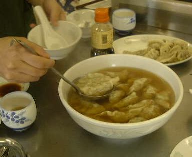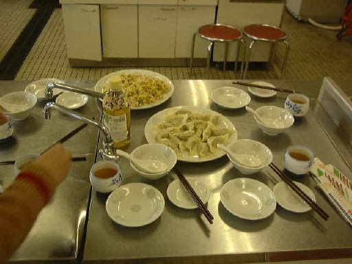 ようやく形になりました。あとは火を通すだけ、この頃になるとすでにお腹はすきすきです(笑)。主にオリジナル皮のやつは、水餃子として茹でられ、別のコンロではスープ餃子用のスープが作られています。やがて浮いてきた水餃子を、お玉ですくって引き上げ、お皿に。さらに別のコンロではチャーハンが作られていますが、ちょっと焦げ付きはご愛嬌。そしてこちらは焼き上がった焼餃子(市販皮仕様)。そして出来上がったものからテーブル代わりの別の調理台のうえに並べられていきました。最後にチンゲンサイも炒められ、終わりが見えてきた会場の様子。まだ調理していない餃子が残っていましたが、ひとまず出来上がったものをいただくことに。席はあみだくじで決定し、おのおのテーブルにつきました。目の前に並べられた料理たちは早く食べてくれと言わんばかりの香りを漂わしています(う〜んたまりません)。そして「いただきます」。歓談をしながらの食事となりました。お味の方は自分達で作っただけあって美味しいです。結構いけます。そんな食事風景はこんな感じ。パクパク食べ続け、ほどなくして初めにあった料理はなくなり、残っていた餃子も調理されました。今度はスープ餃子もありです。とても美味しそうです。しかし、しかし悲しいかなこの時点で結構な数の餃子を食べていたため、お腹が少し限界に近づいていました(うっぷ)。大体予想はつきましたが、最後の方は無理矢理餃子を口に運んでいるという状況になりましたね(苦笑)。生涯これほど餃子を食べることはないだろうというくらい食べました。とはいえ、満足満足です(にっこり)。すべての料理を平らげた後は食器類の後片付け。一通り片付いたところで、Kつさんから「メフィスト」の提供や「ポンツーン」最新号の披露があったり、Aなあなさんからは森先生の奥さんささきすばる氏の貴重な同人誌が披露されたりで、すっかり読書タイムとなりました。そしてRいはちさんからはみんなに早めのバレンタインチョコのプレゼントもありでした(ありがとうございます)。とお腹も少し落ち着いたところで午後3時になり、デザートタイム、アンニン豆腐の登場です。これをいただきながら再びしばらく歓談。その後掃除などをして余った食材をそれぞれもらい、料理室を出たのは午後4時頃だったでしょうか。その後、少し今後の那古野コネクションの予定について意見を交わし、お開きとなりました。参加された皆様、お疲れ様でした。それにしても日記に書くようなレポートじゃないような気も(長過ぎ!)。毎度のことですけども(苦笑)。