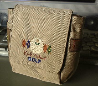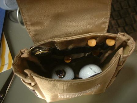 さて、ちょうどお昼時になり、再び三越へ向いました。ロフトでもそうでしたが、女性のお客さんの割合が多いのはどうやらバレンタインデーが近いからですね。小中学生っぽいのがうじゃうじゃいます。みんなでこぞってチョコレート買わんでもええやん、と思いつつも、男一人バーゲンへ赴こうとしているのもどうかと思います(笑)。しかし、そんなことで卑屈になっていてはいけません。何もやましいことはないのですから、ここは毅然としてバーゲンに赴くべきであります。と自分に言い聞かせ、バーゲン会場へ。お昼時だからか混雑ぶりも少し解消された感のある会場ですが、依然として人は多く、やはり女性の割合が多いです(特におばちゃんだ)。他は夫婦かカップルかといったところ。早速、確認済みのカールヘルムのスペースに行き、商品の物色です。すべて50%オフでどれもお買得なんですが、どうせ買うなら普段は手が出せないようなものにしようと高めの物を中心に見て行きます。しかし、予算は限られているので、欲しいものがあってもなかなか絞ることができません。それに欲しいと思ってもいつそれを着るのか迷うようなものもあったりで(つまり魅力的ではあるが実用的ではない)、う〜ん困りました。そんなふうにしばらく悩みながらうろうろしていたらついに、これだ!というものを見つけました。ベルトです。それもなんかパンクっぽくいろいろ埋め込まれていて一体誰がこんなのをつけるんだ?という代物です。これしかありません(笑)。そう言えばこれは前にもお店で見たことがあるものです。そのときは高過ぎて手が出ませんでしたが、今回は半額です。こういうときにこそ普段買えないものを買うべきでしょうということで、値段を見たら、10000円。半額で、です。う、そんなにしていたっけ(はは)。とちょっとひるんでしまい、即決できなくなりました。欲しい服との兼ね合いもありますからね。で、しばらくの間ベルトは保留で服の物色に勤しんでおりました。今思えばそれがいけなかったと思うのですが、悩んでる間になんとそのベルトを手に取っている人がいるではありませんか。どんな人かと見てみたらおじさんです(が〜ん)。「やめといた方が良いですよ。あんたには似合わない」と思わず心の中で念じていましたが、時すでに遅し。お願いだからそれを買わないで、という願いも虚しく、残念ながらそのベルトはそのおじさんの妻と思われる人の後押しもあって買われてしまったのでした(な〜む〜)。そのベルトのことも考慮して服選びをしていただけに、ショックでしたね。予定がくるってしまいました。仕切り直しです。しかし、どう見てみても服ではベルトの代わりは勤まりません(って当たり前ですが、そういうことではなく服はいずれ買うだろうというものばかりで、普段は買わないというものがなかなかないのです)。で、またしばらく悩んでいたのですが、またまた発見。普段は買わないだろうという代物です。今度はしっかり確保してそれを購入できました。それは何かと言えば、これです。カバンではありません。ベルトに通して腰にぶら下げるゴルフボール入れのようです。中を覗くとこんな感じ。予備のピンも入れることができて機能性に富んでいますね。そしてオリジナルのゴルフボールも入っていたのです(わーい)。ってそんなもの買ってどうするんだ!(>自分) う〜ん、確かに使い道があんまりありませんが、なんとなくこれは今買わねばいつ買うんだ、という使命感に駆られたのです(たしかに普段は買わんけども)。あるいはベルトが買えなかったことへの反動からでしょうか。というわけで、なんだかすっかりグッズ集めの様相を呈してしまったバーゲンでありました。まあ、父親へのプレゼントにすることもできますしね(そんなんでいいのか?)。