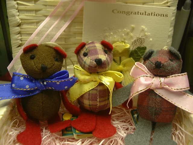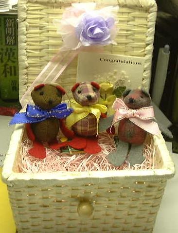 そうだった。昨日届いた荷物ですが、小包で実はトレードしていただいたテディでした。一昨日届いていたようでしたが、留守だったので再び届けてくれたわけですね(黒猫さん)。そのテディですが、なんと素敵なバスケットに入れられていて、しかも1匹の予定だったのが3匹もいただいてしまいました。おまけにオリジナルのリボンを首に巻いています(これはほんとにびっくり)。ということでバスケットに入ったテディたちをここに。もう少し近寄って、すっかりおめかしされたクマトリオ。茨城のEさん、ありがとうございます〜。