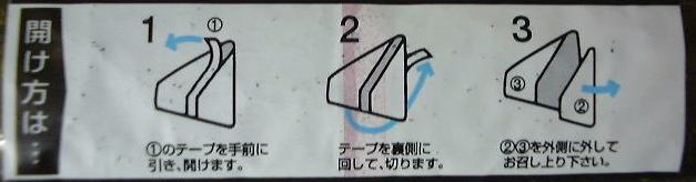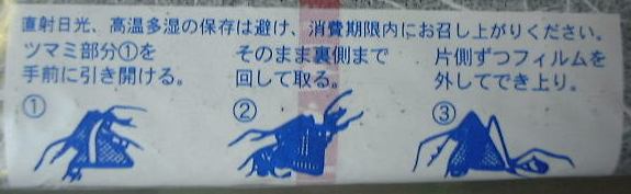 まずは、包みの剥がし方から。おにぎりQの方の説明書きはこのようなもので、比較的簡潔な説明文に簡素化されたイラストで視認性に優れたデザインになっています。一方ウオフクの説明書きはこんな感じ。手まで描いてイラストをリアルしようとしている分、見た目が分かりにくくなってます。余計な情報まで伝わって肝心の剥がし方がぼやけてしまった感じです。これじゃ上手く剥がせない人もいるんじゃないでしょうか(たとえば、赤ちゃんとか)。この辺は、老舗に一日の長があるのかもしれません。