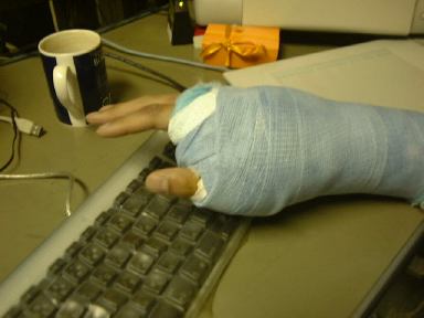 手術室に入ると看護婦さんも先生も水色の服を着て準備をしていました。車椅子で手術台まで連れて行かれ、その上には自力で横になりました(足は依然おぼつきません)。それから右手をテーブルのようなところに投げ出し、視線を遮るように胸から右肩にかけて布が引かれたので右腕は見えません。主治医の他に手のスペシャリストらしい先生もいて、2人によって手術は行なわれました。まずは右脇の下に麻酔を打たれ、神経を刺激され、手のどこがビリッとくるか聞かれました(これがかなり痛い)。さらに骨折している場所付近の親指の付け根あたりに2本ぐらい麻酔を打たれました(これもかなり痛い)。止血のためのチューブを腕に巻かれ少し間をおいて痛みを感じなくなったことを確認されて、いよいよメスで切開です。局所麻酔でしたが見えないので後は何がどうなったのかはよく分かりません。たぶん指を引っ張られたり、くっつきかけていた骨を少し削られたり、針金で固定されたり、縫合されたり、レントゲン写真を撮られたりしたのだと思われます。途中いろいろ聞かれましたが、よく覚えていません。次に手を見たときにはぐるぐるにギプスが巻かれていました。手術が終わったのは午前10時前、実質1時間くらいの手術だったでしょうか。帰りも車椅子で、看護婦さんに病室まで連れて行かれました。麻酔のせいか非常にぐったりで、この看護婦さんは中堅どころかなというチェックするのがやっとでした(<やることやっとるがな)。