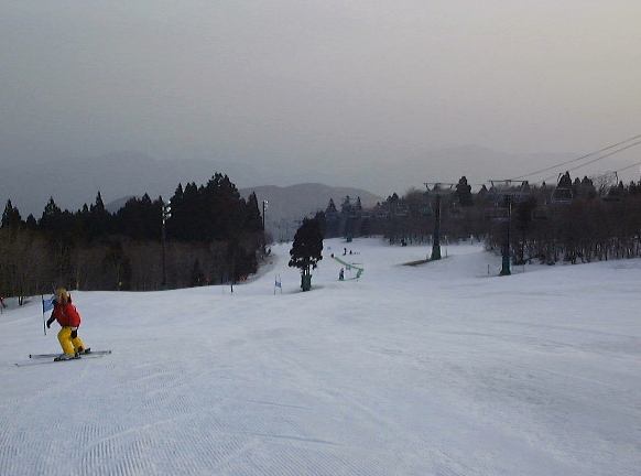 (3/20) 車に乗せてもらう関係上一緒に付いていかなければならずこの日は午前4時45分起きです。しかし、前日電車の中でよく眠っていたので目覚めはすっきり火曜日です。宿舎の朝食もご飯と味噌汁、卵に海苔というシンプルな組み合わせながらもお腹一杯いただいて(内緒ですが)、いろいろバタバタした末予定をオーバしてからの出発となりました。今年からですがそもそも瑞穂ハイランドでスキー部の行事である中枝杯を開くことになったのは、そのスキー場の部長さんがうちのOBの方で、その方のご厚意によるものなのです。なのに集合時間を遅れてしまい申し訳ない後輩たちです。遅刻は相手の時間を奪ってしまう行為です。時間はちゃんと守りましょうね(説得力がないですが)。スキー場の駐車場に到着したら、他の部員も広島からやってきていました。事務所で1日リフト券をもらって(バイトをしていればもらえるのですが、今回はOBのくせして現役のフリをして流れでもらってしまいました)、ゴンドラに乗りゲレンデのある山の上へ。もうひとつリフトで登り、レースが行なわれるゲレンデに到着。すでに太陽が昇っていて朝のゲレンデは清々しいです。先に来ていた人間によってコース準備が始まっていてスタート付近はこんな感じで、下方を見るとこんな感じ。気温も低く雪もまだ固めでした。初め、準備は順調だったのですが、一般のコースとの境界に張るためのロープが絡まっていて、もう少しというところでそれをほどくのに1時間近くかかってしまい予定が遅れてしまいました。