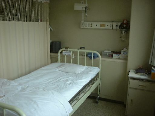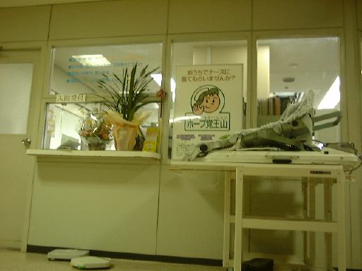 さて、ナースステショーンで、入院申込書とカード状の診察券と保健証を提出し、ちょっとした書類にサインと捺印をして(また左手で字を書く羽目に)入院手続きは完了。しばらく待たされ、暇だったのでナースステーションの窓口を撮りました(<デジカメ持っていったんか!)。やがて病室の準備ができたらしく、病室関係担当っぽいおばちゃんに案内されたのがナースステーションの隣にあるリカバリー室という3人部屋でした。朝の病院は慌ただしいです。そのリカバリー室に入って荷物などをチェックされ(必要なものを出してもらうという意味で)、すぐに楽な服装に着替えることになりました。ベッドに座って待つこと数分、次にやってきたのは若い看護婦さんでした(にこにこ)。まず、抗生物質に対する反応をみるために左腕の皮膚に2箇所注射をされ(ひとつが抗生物質でもうひとつが比較のための生理食塩水らしい)、その反応が現れるまで入院するにあたっての注意事項などの説明を受けました。で、反応の結果は皮膚が赤くなり陽性くさかったので、一度先輩看護婦らしい人が呼ばれ、主治医の先生に診てもらうため1階まで降りることに。そして、診てもらったところ、2箇所とも赤くなっていることからただ皮膚が弱いだけじゃないかという推察をされ、念のためもうワンランク下の抗生物質で試してみることなりました。ということでまた4階の病室に戻り、今度は右腕に2箇所同様な注射をされ、反応を待っている間、怪我をするに至った経緯とか、日常生活に関すること、趣味や家族構成までを聞かれ記録されていきました。性格なんかも聞かれましたね(何て答えたかは秘密)。病院側の策略かもしれませんが、その若い看護婦さんはなかなか可愛くて入院に対する不安は少し和らいだ気がします(単純だなあ・・苦笑)。気になる反応結果は、またしても赤くなってしまいました。再び1階の診察室に連れて行かれ先生に診てもらい、結局安全を見越して一番ランクの低い抗生物質を使用することになりました。初日から注射されまくりです。