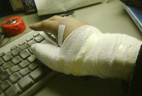 (3/22) ああしかし、キーボードが打ちづらいったらありゃしない! ここ数日の日記を書くだけでどれだけの時間がかかったことか。まったく、親指なんて怪我をするもんじゃありませんよ。こころなしかまた腫れがひどくなっているような気がします。記念に撮ってみましたがこんなんです(グローブみたい)。普段は全然意識していませんが、日常生活をする上では親指が固定されていると困ることがてんこ盛りですね。まず、親指が動かないと携帯電話が使いにくい(持ってないけど)。そもそも電話が使いにくい(そんなにかけないけど)。えっとそれから、電車の運転ができない(もとからできないけど)とか、美味しいミルフィーユが作れない(もとから作れないけど)とか、それに難しい数学の問題を解いたり、女性を口説いたりするのは至難の技です(親指と関係なく)。冗談はともかく、第一に服を着たり脱いだりするのが難儀です。それに手が洗いにくいとか、用を足しにくいとか、風呂に入りにくいとか、全自動の洗濯を除いては水まわりのことはほぼ全滅。キーボードはなんとか打てますが、鉛筆は持てません。柑橘類の皮もむきにくくて困ります。読書もままなりません。そうそう、財布から小銭を取り出すことも難しいのです。そしてなんといっても一番痛いのは、「親指ウォーズ」で一度に一人しか演じられないところです(そんなことか!)。「親指姫」も二人同時に演じることはできません(<親指姫は一人です!<というかそもそも親指で演じるものじゃありません!)。そんな多くの不便を感じる中で唯一良かったと思えることは、右手がまともに使えなくなって、一年間箸の訓練を続けてきた左手の価値がぐんと上がったことですね(笑)。まさにこういうときのための訓練だっと言えるでしょう(できればこういうことはあってほしくはないですが)。おかげさまで食事は滞りなく済ますことが可能です(ただし茶碗が持てないという問題はある)。
