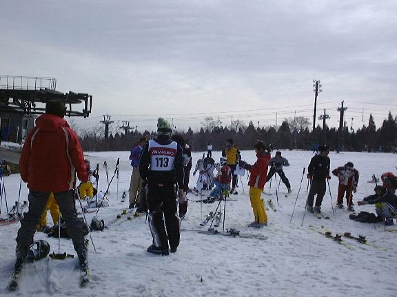 スタートバーを切ってスタート台から勢いよく滑り出し第1旗門通過。その後はひたすら前方を見て行くのみ。徐々に感覚を思い出し、スピードに乗ってきたころに、それは待っていたのです。コースの後半に差し掛かり、足の筋力は早くも限界を迎え遠心力に耐えるのもギリギリ。旗門への入りがだんだんと遅れ気味になってきたのが分かりました。それにもかかわらず焦るあまりついつい無理をしてインコースを狙ったのが間違いでした。なんとか通過できた青色の旗門の次の最後から3番目の赤色の旗門でポールと接触してしまい足を取られ転倒、そのとき右手の親指をひねってしまい激痛が走りました。その後体勢は立て直しゴールをしましたが、指には突き指のひどいやつのような痛みが付きまとい、ストックをまともに握ることもできない状態に。安物の手袋を使っていたからこんなことになったのかもしれませんが、そんなことを嘆いていられないくらい指は痛く、やる気は一気に下がってしまいました。2本目のレースも行なわれましたが、そんな調子だったので無難に滑り降りることに専念してそれなりのタイムしか出ませんでした。よくやるタイプの怪我なのでそのうち回復するだろうと思っていたのがいけなかったですね。パトロールで診てもらうこともせずそのままレース後の片付けも手伝ってしまい親指の付け根は腫れてくる一方です。しかしここまできたらやけくそで、解け始めている雪の上を少し滑ってから、午後1時からの閉会式に向かいました。会場は休憩所にあるラーメン屋。ここではレース結果報告と1位〜6位の人には表賞があり、その他挨拶などなど。主将挨拶の様子がこれかも。不手際なども多々あると思いますが、なにはともあれOBの参加数が増え、にぎやかになったことは非常に喜ばしいことです。これからもどんどん参加者が増え、ますます盛大に中枝杯が開催されることを願っています。今回入賞を逃したのは、手を負傷してしまったからだということを自分への言い訳にしていますが(確実にそれだけではないのですが)、こっそり次回のリベンジを狙っていたりします(笑)。まあそのためには現役以上に努力する必要がありますけど・・。