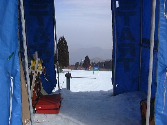 まもなくインスペクション(ポールセットの終わったコースを選手が下見すること)の開始となりました。久しぶりに感じるレース特有の緊張感、高揚感、不安感。懐かしいです。インスペクション後、開会式がありゼッケンが配られスタート付近には現役・OBが集まってそれぞれにウォーミングアップを始め、公式試合さながらの雰囲気です。ちなみにスタート台から見たコースはこんな感じ。午前10時過ぎ、2人の前走がスタートし、いよいよ選手のスタート開始ということでろくな練習もしないまま1番手としてスタート台に立ちました。が、そこで計測機器のトラブル発覚でしばらく待つことに。これで緊張が少し解けてしまったのがいけなかったのか、魔の手はすぐそこまで迫っていたのです。