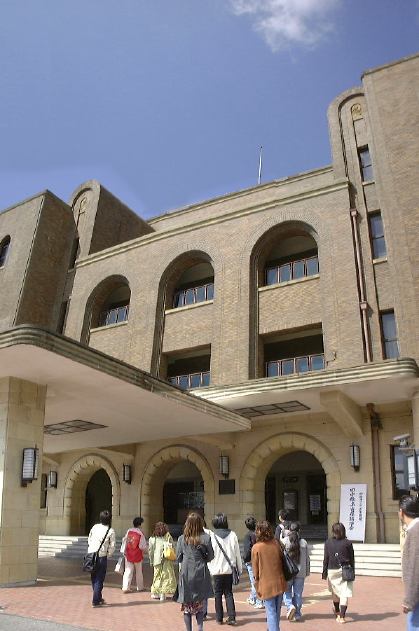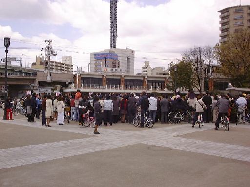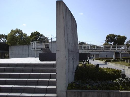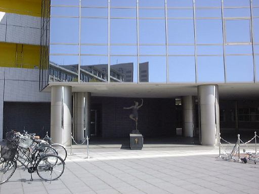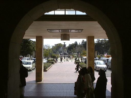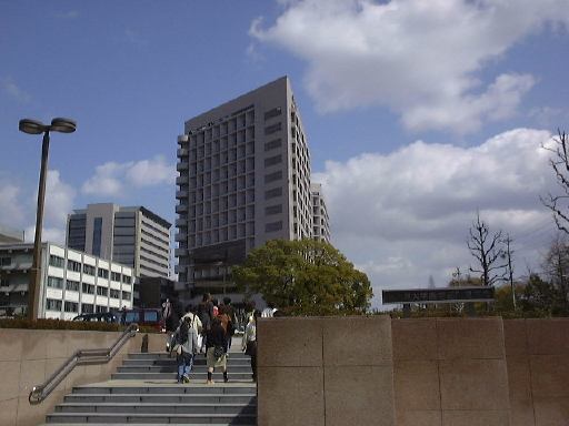 さて、無事鶴舞駅から南東側に出るとそこはもう鶴舞公園の入口です。ちなみに地名である本来の鶴舞は「つるま」と読み、駅名は「つるまい」と読まれるようです。だから「つるまこうえん」。「数奇にして模型」にもそのようにルビが振ってある箇所がありますが、誤植ではないのでお間違えのないように(と言ってる本人が以前その事実を知らないとき、森先生に誤植じゃないかと指摘して恥ずかしかったのは秘密です)。そんな鶴舞公園の入口の広場でまず目に着いたのが黒山の人だかり。何をしているのかと近づいてみたら、サークルの中心で大道芸をやってたみたいで、火の着いた棒を口に入れたりしてました。まあしかし、そんなもの見てる場合ではありません。ちょっと離れて鶴舞駅をバックに記念撮影(人だかりしか見えません)して、集合場所である鶴舞中央図書館。へ向かいました。休日で天気も上々なだけあって人は多いです。ちょっと早足で図書館に着く寸前、前方にKつさんらしき人発見。思わず「あ、Kつさん」と声に出したら、すぐ隣から返事が返ってきてびっくり。どうやら人違いをしていたらしく、偶然すぐ近くを歩いていた本物のKつさんから声をかけられ、驚いてしまったわけです(笑)。それがもう図書館入口のほんの手前で、10秒もしないうちに他のメンバに合流しました。で、集合時間の1時を待たずして全員集合(さっそくギプス姿にツッコミが・・じゃなくて優しいご配慮のお言葉をかけていただきました)。今回の参加者は、会員番号順に、Autumnさん、Tani-Booさん、私ことSばしん、Kつさん、幹事のKずえさん、東京からはるばる参加されたKえずみさん、Mつるさん、Sずかさん、Freeさん、Akiraさん、Aなあなさん、Mなださん、Lady Leeさん、Yうらさん、と大所帯(伏せ字の意味なしの人もいますが)。全部で14人のメンバです。挨拶などもそこそこに、第5回那古野コネクションオフ会、通称「恋之坂デイタイムウォーク」の始まり始まり〜。今回散策する主なところは長編「数奇にして模型」と短編「恋之坂ナイトグライド」に出てきた名所が中心です。ちなみに集合場所の図書館入口前はこんな感じ。ほどなくして、図書館から公園内に向かって歩き出す一行なのでありました。