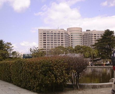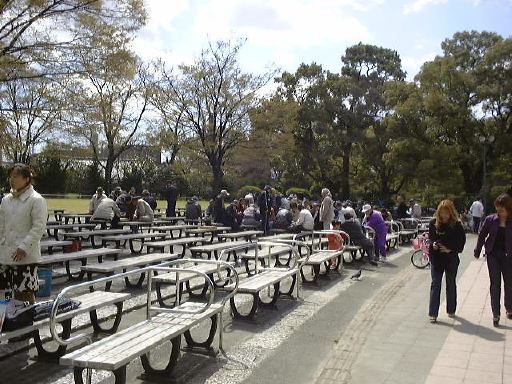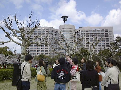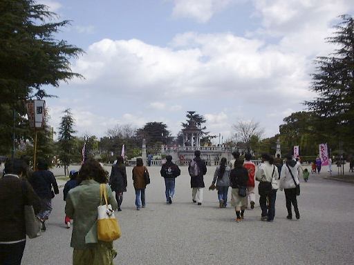 まずは、そのままそれぞれにおしゃべりをしながらゆっくり噴水のある公園中心部へ。大勢で歩く様は、「Gメン'75」を彷佛とさせます(笑)。歩きながら途中、Kえずみさんにはお願いしていたトーマ君シールと練ちゃんシールをいただきました(ありがとうございます〜)。さて一行は噴水の右側(南側)を通り、池の前で一瞬遠目に名大病院を眺めて、南東方向へ延びる道へ右折。そしてすぐに左へ曲って古墳跡らしき広場に出ました(しかしここは「数奇にして模型」に出てきた古墳ではありません)。日曜日の昼下がり、囲碁や将棋をする老人、合唱か何かの声合わせをする人たちなど、いろんな人が集まっています。しかし、そこに混じることもなく(当たり前だ)その場は通り抜け、ちょっとした広場にて、わいわいと名刺交換となりました。毎度のことながら端から見ると怪しい集団です(笑)。実はその広場、ラジオ体操をするための場所らしく、無理な体勢にしか見えないラジオ体操の像が立っていました。ここから北を望めば名大病院がさらに大きく見えてこんな感じ(ラジオ体操の像は小さく写ってます)。周りには犬の散歩をしている人が結構いましたね。名刺交換も終わり、落ち着いたところで場所移動。次は例の首切りがあった現場、名古屋市公会堂です。直線距離ではすぐそこなのですが、公園の垣根のレイアウトが遺憾なく発揮され、見事に我々を遠回りさせます(城みたい>ただし無理をすればまっすぐ進めなくもない)。近づいて行くと、そこには桜の木がたくさん植えられていてこのように八分咲きといったところ。そこかしこではお花見をして昼間からできあがっている人たちで大にぎわいです。ちょっとした出店も出ていて良い香りを漂わせています(桜の香りは台無しですがお腹を空かせる効果は抜群です)。そんな誘惑を振りきり目の前にようやく現れたのが、青空の下堂々と建つ公会堂(パノラマ風につなげてます)。さっそく中へぞろぞろと入って行きますが、行けるのは入口手前まで。建物の中へはイベント関係者じゃないと入れないのです(このときは誰かの講演会が開かれていた模様)。2000年6月に森ぱふぇのオフ会で入ったときのことを思い出したり、守衛室を探したりしつつ、しばらくそれぞれに妄想を膨らし子。振り返って公会堂入口から正面の噴水を眺めるとこんなふう。その後は建物の西側をまわって北方向に鶴舞公園を脱出、道路を渡り、名大病院の敷地へと入りました。