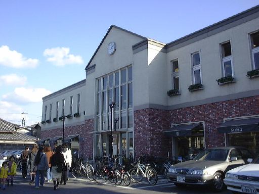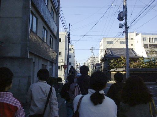 再び住宅街をくねくねと進み次に向かったのは、少し前まで森先生がよく行かれていたらくだ書店です。初めてここを訪れた人(自分も含む)はその本屋には見えない外観に驚きが隠せない様子でした(誇張あり)。なかなかおしゃれな建物です。2階にはケーキも売ってる喫茶コーナや、インターネットができる端末などもありました。中ではめいめい立ち読みしたり本を物色したりで小一時間。影も長くなってきた午後4時半頃、ひとまず終了になりかけるも地理に詳しくない人もいるということで、地下鉄の駅まで歩いて行くことになりました。その様子はこんな感じで、日射しが少なくなり結構肌寒かったですね。住宅街をゾロゾロと歩く様は客観的に見てやっぱり怪しい集団です(苦笑)。しかしそれでも歩くのが森ぱふぇ魂ってやつでしょう(と勝手に解釈)。やがて今池駅近くに到着。そこで最後に見たものはハムサロンでした。もちろん「ハム」ってアマチュア無線の「ハム」で、それ関係の品物を売っているところですが、その看板が1階部分のすぐ上にあるため、本当は目立たないところに入口があって店鋪は前面に出ていないのに、てっきりすぐ目に着く1階部分がハムサロンかと錯覚するのです。そしてそこあるのは、たぬきの置き物などが並べられている陶器屋さんなのです。それはもうたぬきの置き物に無線が内蔵されていると勘違いしてしまうこと請け合いです(笑)。などとお店を冷やかして、最後は出合いふれあい親子馬という銅像が立っている場所で、午後5時頃の解散となりました。とりあえず、お疲れ様でした。