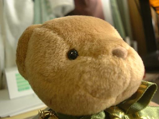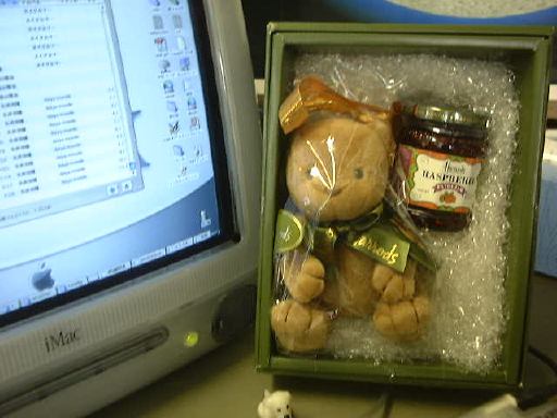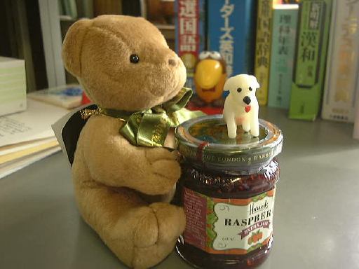 (4/15) 昨日は寝坊はあんまりできず、9時には目が覚めました。目は覚ましましたがすぐには布団から出るようなことはしません。目覚まし代わりのラジオをしばらくぼ〜っと聴きながら横になったまま。こうして少しずつ血圧を上げていくわけです(時間があるときは)。そうやって睡眠の残滓を貪っていたら予想外に早く荷物が届きました。郵便でもなく宅配便でもなく三越の配送サービスからです。ちょっとうとうとしていたので(寝とったんか)、不覚にも受け取る時の反応は鈍くなってしまいました。何が届いたかと言うと、ラズベリージャムです。ええと、もうひと月くらい前になりますがバースデーテディをお譲りした方からのお礼の品なのです。こちらに送られたということは予め聞いていて、何が入っているかは分かっていましたが、しかし、実際届いたものを見てみると包みの箱が結構大きいではありませんか。ジャムが入っているにしては大き過ぎます。期待の鼓動がひとつ(ドクンッ)。気になるのでそれを受け取ってさっそく包み紙を外しにかかりました。期待の鼓動がふたつ(ドクンドクンッ)。そしていよいよ箱のふたをそっと持ち上げ中身の全貌が明らかに!(ドクンドクンドクンッ) なんと驚いたことにラズベリージャムとともに体調20センチメートルくらいのテディベアが入っていたのです(うわ〜いうわ〜い!)。もう、嬉しさのあまり回り出しそうなくらいでした(クルクル〜)。Harrods(ハロッズ)のラズベリージャムをいただけるとは聞いていましたが、それまでHarrodsなんて知りませんでしたからね(笑)。まさかこんなおまけ(にしては存在感ありあり)までついてくるとは夢にも思っていなかったのです。手紙も先日いただいて、お礼の言葉もありません。茨城のHさん、ありがとうございます〜(感涙)。テディベアがあまりにも可愛かったので写真に撮りました。ジャムとともに箱に入った状態。あと、箱から出てきてジャムを抱くベアとか、アップも(笑)。本当になんだかもったいないものをいただいてしまいましたね。末永く大事にしたいと思います。ちなみに名前はまだありません(性別も不明)。クマ好きのあの人だったらどういう名前をつけるんでしょうか(にこにこ)。いやあ、こういうことがあるとバースデーテディのページを作って良かったなあとしみじみ思いますね。一時の盛り上がりもなくなって、テディはもうそろそろ潮時かなと思っていただけに余計に嬉しいです。もう少し続けてもいいかもしれません。細々とでも可能な限り集め続けようかなと。