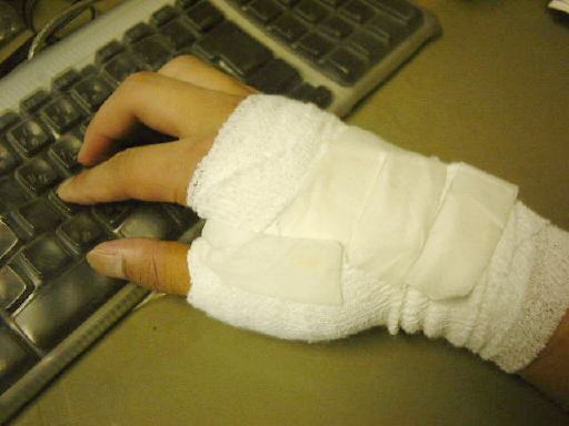 やがて先生がやってきて、諸々の準備が整えられて手術開始となりました。前回同様、右手には消毒液をたっぷりと塗られます。そして麻酔の注射が3本。実はこれが一番痛かったりします。医学の進歩を実感するのはこの後ですね。麻酔の効き方が恐ろしく早いのです。局部麻酔だからかもしれませんが、あっという間に麻痺したみたい(しかし指はちゃんと動く)。ほんのわずかな感覚は残っていましたが、すぐに切開されて中の針金が抜かれました。目の前が布で仕切られていたので、もちろんこの様子を見ることはできません。だからあくまでも想像です。本当は超自然的な力で切ることなしに針金が除去されたのかもしれませんが(笑)、確かめる術はないので自然的な力で普通の手術が行なわれたと想像するのが妥当でしょう。そうこうしているうちに1針ほど縫われ(それくらいの手軽な手術だ)包帯を巻かれて完了。30分もかからなかったですね。あ、でも術後も点滴が完全になくなるまでそのまま寝かされてはいました、5分くらい。