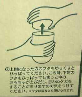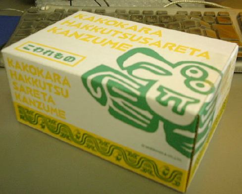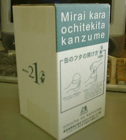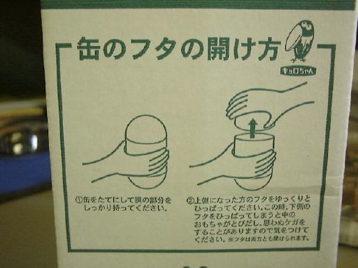 えっと、ちなみにプレゼントするカンヅメは「過去缶」と「未来缶」の2つセットなのです。とりあえず外箱の外観だけを写真に撮ってみました。これが「過去缶」で、そしてこれが「未来缶」。「未来缶」にはこのような“缶のフタの開け方”が描かれていますが、「過去缶」の方にはそんなものは描かれていません。やはり未来から落ちてきただけあって「未来缶」はユーザに優しくなるように心掛けられていて、「過去缶」は過去から発掘されただけあってわざわざ開け方なんて書いてないということでしょうか(ひょっとするとこの絵が開け方を表しているのかもだけど(笑)、いずれにしても解読は不可能)。ん?ちょっと待て。なんか引っ掛かるなあ・・。さっき変なものを見たような気がするぞ。え〜と、確かフタの開け方のところで・・そうそう、これですよ、これ。やっぱりそうだ。よく見てください。両手でフタを開けているこのイラスト変じゃないですか? どう見てもどっちの手も右手でしょう、これ! うわーさすがに「未来缶」だなあ。そうかそうか、未来人は両手とも右手なのかー(笑)。あるいはE.T.の有名なシーンよろしく、フタを開けるために二人が協力しているところとか(大笑)。あ、そうじゃないとしたら、どちらかの手は手の甲側で缶をつかんでいるという可能性も考えられますね(ちょっと気持ち悪いけど不可能ではない人もいる)。う〜ん、これって誤植というのかな。それとも何か意図があって描かれているんでしょうか・・ふむ〜。今まで誰にも突っ込まれなかったのかどうか、気になるところです。せっかくのチャンスということで、ここはひとつ森永製菓に質問してみるべき?(笑) 中身は秘密です(まだ開けてない)。