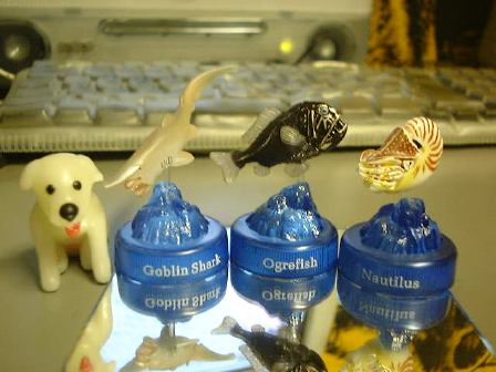 ここで少し休憩。地下に降りてから地上に出て5人が座れそうな喫茶店を探索。結局入ったのはロイヤルホストでした。土曜日だからか人は多くて喫煙席へ。そこでおのおのにドリンクを注文して、TAKUさんとMつるさんとMむさんはアイスクリーム系のデザートも注文。30分ほどでしょうか、しばらく談笑してました。しかし、印象的な話題は、Mつるさんが食べていたアイスの名前が「ブルボンアイス」とかなんとかといって、それにはスティック状に巻かれたクッキィみたいなお菓子が刺さっているのですが、もしかしてこれがブルボンのお菓子だから「ブルボンアイス」という名前なの?という疑念が沸き起こったことでしょうか(笑)。まさかねぇ、とは思いつつも店員に訊くことはできない一同でありました(謎のままにしておいた方が幸せなこともあるのです)。あと気になったのは、テーブルの上に人数分敷いてある紙製の下敷き。これの下の方に「店内での携帯電話のご使用はご遠慮下さい」みたいな注意書きが書いてあるのですが、そのすぐ下には「詳しい情報はHPをご覧下さい」とあってアドレスが書いてあります! これじゃその場で携帯電話を使って確かめたくなりますよねえ(笑)。なんだか矛盾しているというか、人の自制心を試そうとしているというか・・ツッコミを入れたくなる下敷きでした(笑)。そうそう、ここで実はKずえさんから以前お願いしていたダブった分の「深海生物フィギュア」をいただきました(ありがとうございます〜)。いただいたのはこの3つ。これは何かお返しをさせていただかないといけませんね〜(にこにこ)。