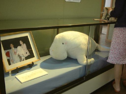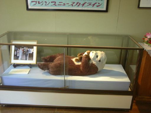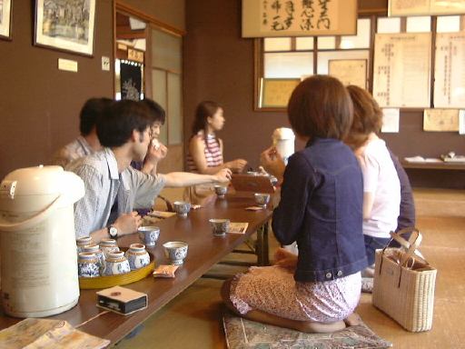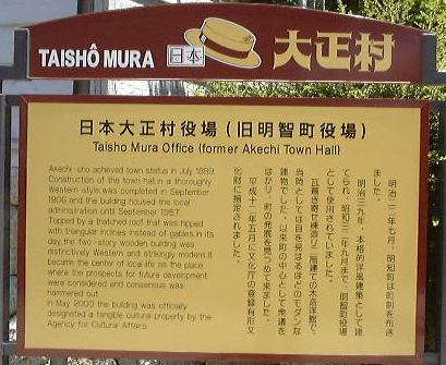 ええと、ではレポートの続き、メンバが揃って大正村めぐりへ出発したところから。まずは駅前の道を東へ向かい、交差点を右へ、駐車場のある方向へ向かって歩きます。途中、浪漫亭を横目に見つつ、正面ゲートっぽいところから浪漫横町へ入って行きました。そのままレストランや土産物屋がある浪漫亭の南側を通り過ぎ、何川かは分かりませんが橋を渡って本町へ。途中には大正村には似つかわしくない激しい音楽を通りに向かって鳴らしている土産屋がありました。それほど文句があるわけではありませんが、街の中で一番浮いている存在で、ちょっと気になるなという感じ。それも通り過ぎれば忘れてしまいます。本町の交差点はT字路で、角地には景観を合わせているのかこんな十六銀行が。この交差点を北(地図では左)に曲るとすぐにコロッケ屋のコロちゃんがあります。これはチェーン店のようですが、大正村はコロッケも有名なんでしょうか。この通りは南北街道で、少し先の左手に現れたのが森先生が「一番の見所」とおっしゃっていた(2001/5/13の近況報告)大正路地です。しかし、こちら側には歩いて行かず、反対方向の東側へ向かいました。足下を見るとこういう絵があります。どうしてパンダなのか分かりませんが、Mつるさんでしょうか(内輪ネタか)。そしてこの東側の路地を登って行くと左手に見えてくるのが元役場の大正村役場。説明書きはこんな感じ。当時としては超モダンだったらしい建物も今ではレトロですね。この役場の前庭には天然記念物のヒトツバタゴ(なんじゃもんじゃの木)が植えられています(これが説明書き)。個人的にはこの木が見られたことが非常に満足ですね(にこにこ)。思わぬ収穫でした。さて、役場の中に入ってみるとすっかり改装されていてコンクリート張りだったということはなく、微妙に床が歪んでいたりする趣き深い木造です。ここには休憩室があって、とりあえずそこで休憩することになったのですが、その部屋の前の廊下には村民登録者の名前が書かれた札がずらーっと掛けられています。ひょっとしたら森先生が登録されているのではないかという声もありましたが(笑)、さすがにそれはなかったようです(しかし、全部確認したわけではないので分かりませんけども)。休憩室の中にはお茶が用意されていて、無料でいただけるようになっています。ということで一角を那古野コネクションが陣取り、名刺交換と相成りました。他のお客さんは少ないので邪魔にはなっていなかったでしょう。名刺交換が一息ついたところで、TAKUさんからはお土産(キティちゃんのバターサンド?)が振る舞われ、みんなで美味しくいただきながらしばらく歓談となりました。「ここで森試験をしてもいいかもね〜」という話が出たりで(笑)、すっかりくつろぎモードです。しかしまだまだ序盤、あまり長居もできません。この頃にはすでに正午を回っていましたが、もう少し村内を見て回ってから昼食にしようということになり、役場を後に・・する前に、展示してあるものを見学しました。まず休憩室には、旗本明智遠山氏系図と明智遠山氏系図などがありましたが、歴史に詳しくないので解説できません(苦笑)。それから2階へ上がると、村長室(入ることはできない)があり、その奥には日本大正村の歴史に関するパネル展示がなされていました。しかし一番印象的だったのは鳥羽水族館から贈呈されたというラッコとジュゴンでしたね(笑)。
