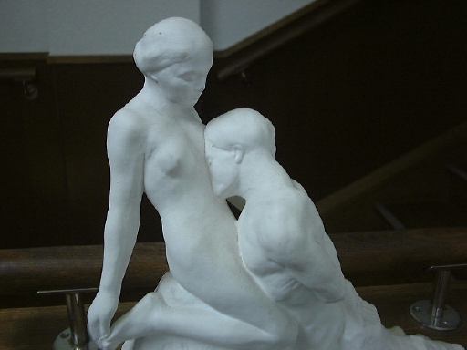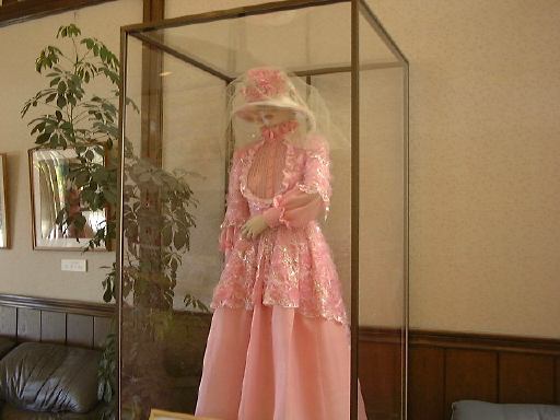 さて、次は来た道をずっと戻って南北街道まで出ます。その途中にあるお店で気になったのがのぼりに書いてあった牛乳棒という代物。濃縮新鮮ということでしたが、なかなか怪しい響きです(笑)。牛乳房ともとれますしね(<思考が偏っとるぞ)。えっと、それはともかく、南北街道を今度はまっすぐ南へ進み、大正村資料館(まだ入りません)を過ぎたあたりで西へ右折。川の手前で狭い路地に入ってずんずん進んで行くと、そこはもう中馬街道のうかれ横町です(道路を跨いでいるのが渡り廊下のある家の渡り廊下)。その先にあるのが、ぱふぇら〜にとっては大正村のメインとも言える(笑)、グリル田中です(地図では「元カフェー」と書いてあるあたり)。犀川先生と萌絵が入ったあのかつ丼屋さんですね。他のメニューは無いという噂もあります(笑)。はじめから期待はしていませんでしたが、やはりこの日も休業でした(しかも臨時休業だ)。残念無念。しかし、なんと今回の参加者の中に、4、5年くらい前グリル田中でカツ丼を食べたことがある方がただひとりだけおられました。それはPさん。だからもうみんなから「どんな感じだった?」と訊かれまくりマンボでした(をかへま氏風)。ただ、もう記憶が曖昧だとかで返答に困られていましたが(笑)。というわけで意気消沈する一行(誇張あり)は、来た道を引き返し、大正村資料館からの道に再び出ることになりました。その途中、民家の軒先のこんなところに鳥の巣を発見。中にはヒナがいる模様です(くちばしがのぞいてます)。それから、遠山家屋敷跡なんてのもありましたがそんなとこには目もくれず(笑)素通りし、路地から出て西へ。明智橋を渡り、川沿いの道を歩いて駐車場まで戻りました。駐車場から道路に出るところにはこんな物が設置されていて(実は村のところどころにある)、ボタンを押すと案内が音声で流れるようになっています。「日本語」と「英語」の2種類です。英語のボタンを押してみるとちゃんと英語で大正村の紹介が流れ始めました。この日は天気に恵まれて見上げれば透き通るような青空(本当は透き通ったら月のように黒い空になるはずですが、そんなことを気にしてはいけません)、歩いているだけで汗が滲んできます。お腹も空いてきたということで、流れる英語の音声はそのままに(そんなもの待ってられないのだ!)、道路を渡って最初に目にした浪漫亭のレストランで昼食を摂ることになりました。1階は土産を売っているスペースで、レストランは2階にあります。エレベータも一応設置されていましたが、それには乗らず階段を使って上がって行きました。ちなみにこのエレベータの扉にはアルフォンス・ミュシャの絵にどことなく似ているけど明らかに本物じゃないという絵が描かれていましたね(写真を撮っておけばよかったか)。あと、階段の途中にはなぜかこんな置き物が(恥かしいなあ)。レストランのフロアは結構な広さがあり、空いていることもあって全員が同じ列のテーブルに着くことができました。総勢9名です。誰が何を注文したかというのは省きますが、注文された料理はソースかつ丼、ハヤシライス、かつ定食、薬善そば(という名の山菜そば)、そしてコロッケカレーというラインナップ。レストランの内装やウェイトレスさんの服装などは大正時代を意識してあるようでしたが、料理のお値段だけはちゃっかり21世紀価格でしたねぇ(笑)。談笑しながら小一時間。午後2時を過ぎた頃、レストランを後にしました。