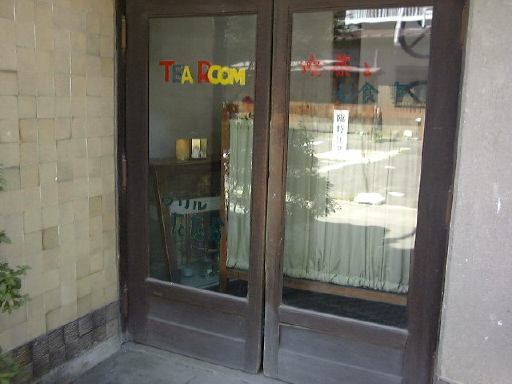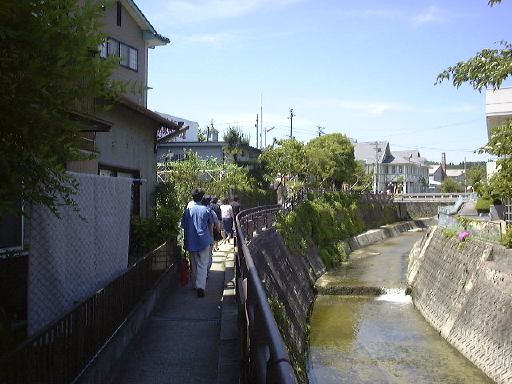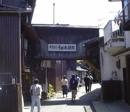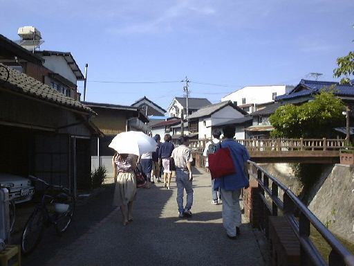 さて、あとは戻りつつの見学になります。南北街道を北に向かい、中馬街道との交差点で南西方向の中馬街道へ入り、途中で大きな通りに出たところに、4つ目の有料資料館、天久資料館があります。大正から昭和にかけて京都にあった「カフェー天久」を復元したものらしく、入るとここの1階は喫茶店になっていて大正時代を彷佛とさせる音楽がかかっています。しかし、カフェーでくつろいでる時間はありません(笑)。さっさと2階へ上がり、展示の品々を見て回りました。飾ってあるのは艶かしい女性が描かれているビール会社のポスタとか、器とか、蓄音機など。テーブルの上には一見メニューかと思わせるものが置いてありますが、実はこの天久資料館に関する新聞記事のコピィが綴じてあるだけです(笑)。充分に堪能した一行は、この建物が面している通りを西へ行き、橋を渡って、またまた川沿いの道を進んで行きました(先ほどとは違うところ)。その途中ではうかれ横町に通じる路地にある喫茶店の裏側を見ることもできます(笑)。抜け目がありませんね。明智大橋に出てからは先ほど通った川沿いの道を再び通り、駐車場まで向かったのでした。