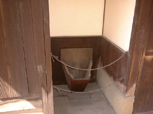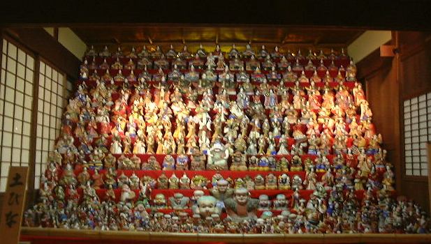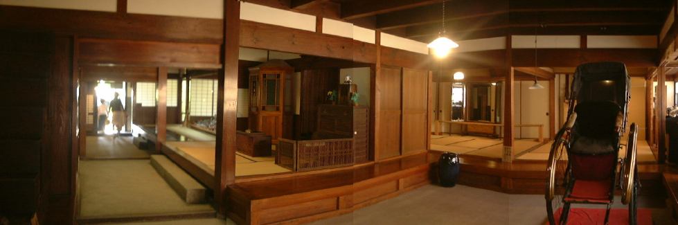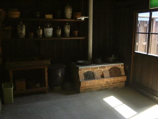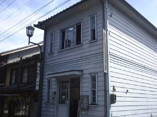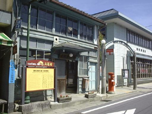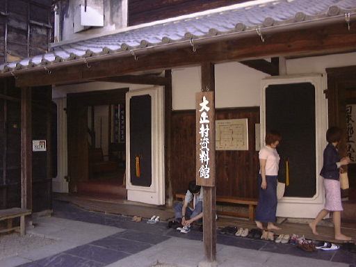 さあ、いよいよ後半戦突入です(まだ半分もあるのか!と嘆かないように)。とりあえずは村の南にあるおもちゃ資料館を目指して歩くことになりました。最初に渡った橋を渡り、再びガンガンに音楽を響かせている土産屋を過ぎて、十六銀行のある交差点を南に右折。その南北街道を南へ進んで行くと、左手に元郵便局の逓信資料館(隣には現在の郵便局)があります。中では郵便や通信に関わるものが展示されており、入館は無料です。展示スペースがワンフロアしかないので見学時間は短かめ。その逓信資料館の向かい側に、先ほど通り過ぎた大正村資料館があり、次はこの中に入って行くのだ、オーオー!(意味も無く気合いを入れてみました)。ここには銀行蔵と大正の館の二つの建物があって、まずは銀行蔵(奥に見える建物)に入ります。土足厳禁です(ちなみにTAKUさんの靴は脱ぎにくいのであった。>そんなことをばらさないように)。4階建ての建物ですが、展示室は1つの階に2室ずつの合計6室です。しかし全体は大きく北側と南側に別れていて、北側の1階から3階まで昇り、3階で南側へ移り1階まで降りるという見学順路になっています。このときの展示内容は、日本全国の土人形とか、数多くの古い蓄音機とか、昔の映画のポスタとか、昔の看板とか、あと古い楽器の類い(やけに足踏みオルガンが多い)などなど、大正時代のものに限らず様々な物が展示されていました。季節によって展示替えが行なわれるそうなので、何度来ても楽しめるかもしれません。個人的にはこの新聞記事を見れたことが嬉しいです(にこにこ)。そうそう、この銀行蔵には手動エレベータがあったらしく、その形跡が残っています(下から見上げたところ)。蔵から外に出て、靴を履き、今度は南隣にある大正の館(説明書き)に入って行きました、勝手口から。外には用を足すところがあります。館の中に入るとそこは台所になっていて、土間が東側の表の方まで続いています。建物の中は必要以上の照明はなく、空気もひんやりしていて実に居心地が良い空間です。一室には驚異的な数のひな人形が飾られています(少し無気味)。ずっと奥に入って表側の土間から見渡すとこんな感じ(つなげてポン)。外に出て表から見るとこんなたたずまいです。
