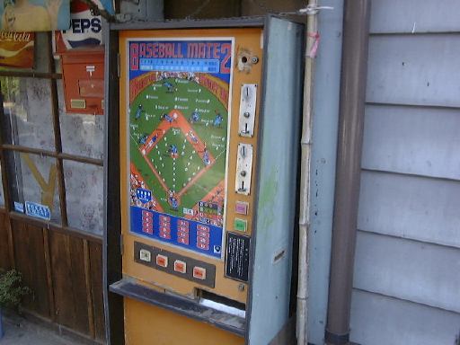 南北街道をさらに南に進んで行くと、やがて中馬街道との交差点があり、解説看板も立っています。しかしまだまだまっすぐ南へ向かう一行(人の間隔が離れていますが別に仲が悪いわけではありません(笑))。そしてようやく右手に現れたのが、おもちゃ資料館です。ここでは入口におばちゃんが3人くらいいて出迎えてくれます。展示内容は、紙細工あり、ブリキあり、サザエさんの人形あり、双六あり、面子やコマもありで、文字通り昔のおもちゃたちがいろいろです。印象的だったのは顔がついたブリキのバス(?)で、その目玉がどうやら全体の動きに合わせて動くようになっているのがあって、想像すると非常に怖いのです。Kさん曰く「これじゃあ子供が泣きますよ」とのこと(笑)。建物が狭いこともあり、帰りのバスの時刻も考え、長居することなくおもちゃ資料館から外に出ました。その南隣にあった商店の店先にもいろいろ懐かしいものがあって見ていたのですが、中でもこれが気になって、数人でしばし眺めてしまいました。煙草の自販機ではありません(見りゃ分かる)。しかし新手の募金箱という可能性はあります(笑)。Kつさんによると、小学生の頃に見た記憶があるとか。昭和生まれの我々にとってはこういうものの方が、大正時代のものより懐かしさを感じるんでしょうね(当たり前ですが)。