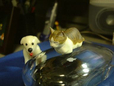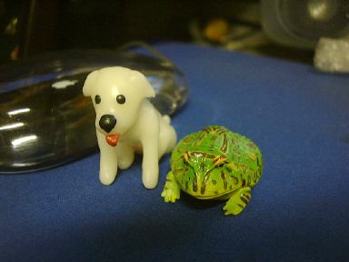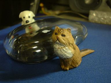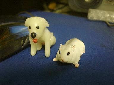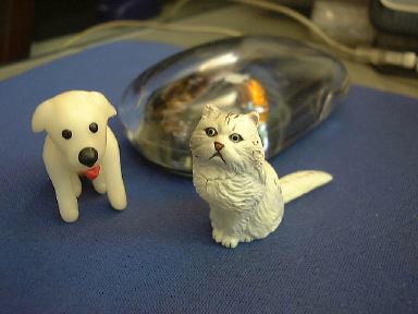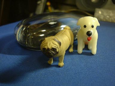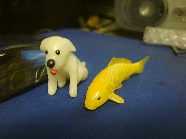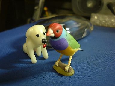というわけでチケットは翌日受け取ることにして、今日のところはお菓子でも買って帰ろうと思ったら、なんとここでチョコエッグ発見ですよ! 復活しています。わ〜いわ〜い生協万歳!(泣いた赤子がもう笑ったみたいな手のひらの返しよう) 思わず小躍りせんばかりに3つ購入。まず1つ目を食べてみたところ出てきたのは、ブルテリア(ブリンドル&ホワイト)。残り2つは温存(というか溶けるので冷蔵庫で「冷存」)しておくつもりでした。が、どこからともなく現れたM2のK村さんが「ねぇ、開けてよ」なんていう圧力をかけてくるもんだから、敢え無く屈して(苦笑)仕方なく2つとも開封してしまったのは、私が心広くて女性に優しい人間だからではありません(私は心広くて女性に優しいが)。そもそもK村さんは女性とは・・(以下自粛)。ごほん。えっと、とりあえずフィギュアを取り出すためにチョコを食べます。2つ目のチョコは結局全部ばくばく食べて、出てきたのはパグ(フォーン)でした(駄洒落か)。わーい、またもや犬です〜(にこにこ)。その勢いのまま3つ目も開封させられてしまいましたが、さすがにチョコは半分だけ残しサロンの冷蔵庫へ保存しました(これもしばらく後に食べてしまったのだけど)。そして出てきたのは日本猫(雉子+白)。にゃ〜お。なんか動物ばっかり出ますね(<そりゃペット動物シリーズだから)。いつまでも動物ばかりじゃ芸がない(いや、充分に芸はある)ので、次は世界の遺産シリーズとかをチョコエッグに入れて欲しいところです(笑)。それか、もっと的を絞ってピラミッドシリーズとかにしてしまい、ひとつのチョコエにはひとつのブロックが入っていて、コンプリートしてはじめてピラミッドが完成するというのはどうか。もちろん、てっぺん部分を担いだシュウもパーツの一部です(<北斗の拳かよ!)。あそうそう、以前買って撮り忘れてたペルシャ(チンチラゴールデン)とコキンチョウ(アカコキンチョウ)もついでにここに。