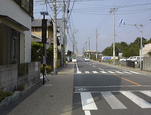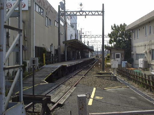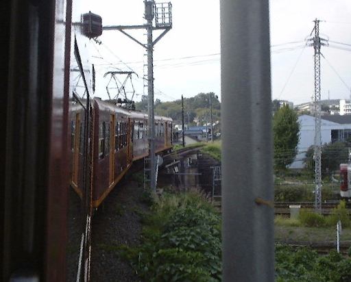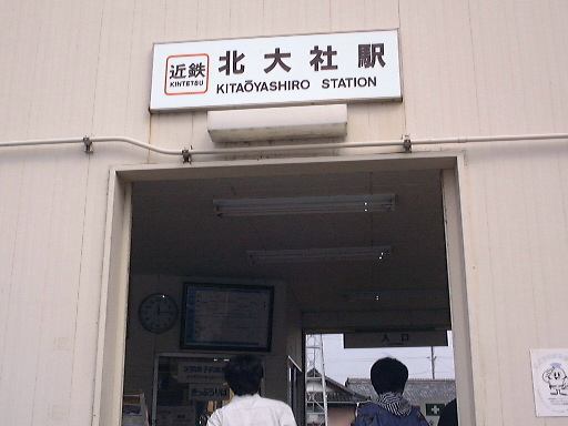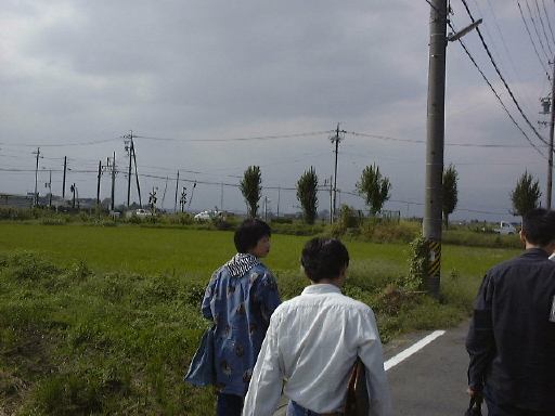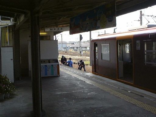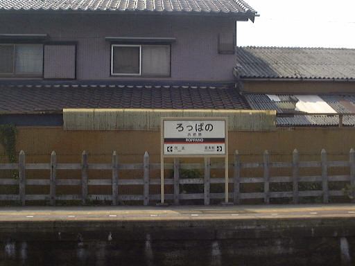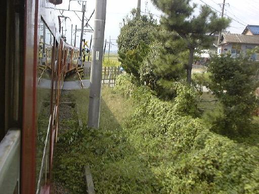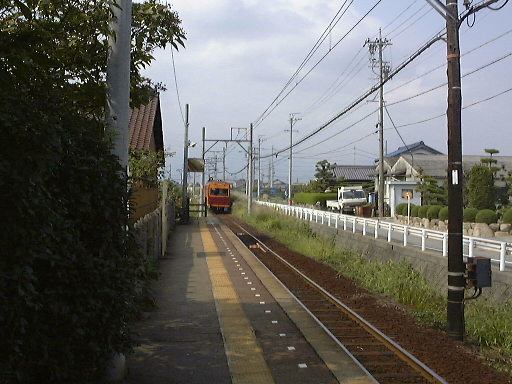 言い忘れましたが、北勢線はもちろん単線なので、帰りの電車が来るまではかなり待たないといけない駅もあります。なので、折り返し予定だった北大社駅のひとつ手前の六把野駅で降りて、北大社駅までは歩いて行こうということになったしだい。線路沿いの道をのんびり15分くらい歩きました。このあたりはすっかり田舎で、周りには田んぼばかりが目立ちます。途中で桑名に向かう電車とすれ違ったり、植えられているものでしょうか、道ばたには秋らしくコスモスなども見かけられました。そして遠くの山の霞みを気にしつつ歩くぱふぇら〜が4人。全然人に会わないまま(笑)やがて北大社駅に到着。駅舎は遠目にはアパートみたいな構えをしています。入口はこんな感じ。すでに電車がホームで待っていたので西桑名までの切符(320円)を買って改札を通りました。その電車はおそらく北大社駅発の電車だと思われ、中にはまだ誰も乗っていません。結局出発したときに乗っていたのは我々の他に1人だけでした。12時27分に発車。いくら住宅が近くにあると言っても、やはり機動性の良い自動車が普及するとなかなか電車は利用されないのかもしれません。桑名が近づいてくるとそれなりに乗客は増えていきましたが、自動車に乗らないような学生とお年寄りばかりだったことからもそのことが伺えます。車窓から後方を見るとこんな感じ。カーブがきついとこうなります。