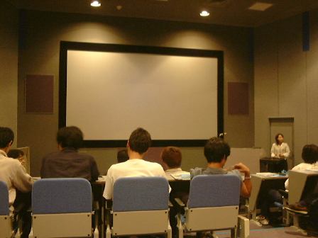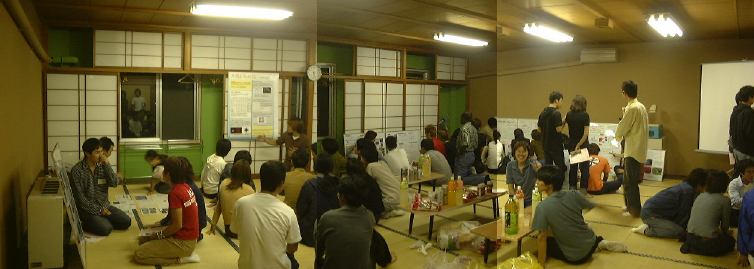 夕食後、午後7時半からはお酒を飲みながらの教官による研究紹介です。OHPやプロジェクタを使っての1人30分ずつで、S野先生とY田先生とT所先生の3人3様の講演でした。プロジェクタの準備に手間取ったこともあり終了したのは予定を少しオーバした9時前ぐらいだったでしょうか。その後は引き続き2日目の懇親会へと流れていきました。その間に各自お風呂に入るようになっていたので、空いてるうちに先に入りましたが、とても広くて快適な浴場で湯舟に浸かりながら思わず寝てしまったほどです。えっと、正直言って今回の学外セミナで何が一番良かったかと訊かれれば、迷わず「お風呂」と答えるでしょう。給湯器の不調でずっと当たっていたら凍えてしまうような水のシャワーを毎日浴び続けてきたここ1ヶ月、だんだん慣れてきた感もありますがやっぱり冷たいシャワーは辛いです。それが、久しぶりに温かいお風呂に入れるとなれば、これはもう参加しないわけにはいかないでしょ!(笑) そう、まさに個人的にはお風呂のための学外セミナと言っても過言ではないのです(<そんなこと言ってないでさっさと修理を頼みなさい)。だから、ここぞとばかりにしっかりと身体の芯まで温まりました(ほくほく)。その後、懇親会に参加して、日本酒を飲んだり感じの悪い(良い意味で<どんなだ(笑))森さん(名前を出すな)としゃべったり、楽しく過ごして終わったのは12時を回った頃でした。しかし、最後にやられましたねぇ。片付けをしているとき部屋の外からやってきたおじさんに、「責任者は誰だ? ちょっと来い。うるさいぞ。もうちょっと考えろ」などなど注意されてしまったのです。部屋からの声が漏れていたいみたいですね。そのおじさんは一緒に宿泊している高校教師でした(いかにも生活指導の先生っぽい)。本当の責任者はその場にいなかったため、注意されたのは主にT辺氏でした(ご苦労様です)が、すでに終わりかけだったのは幸い。なんか久しぶりに高校生に戻った感覚を味わいましたね(とほほ)。歯を磨いて、昨日に比べたら断然早い就寝となりました。