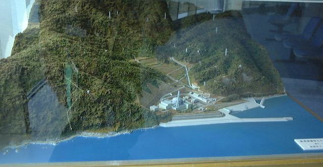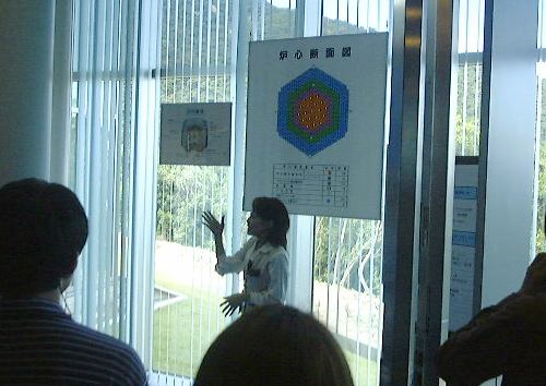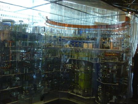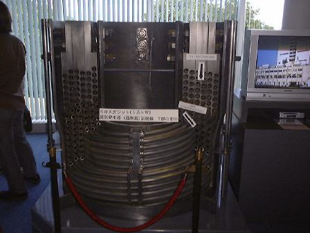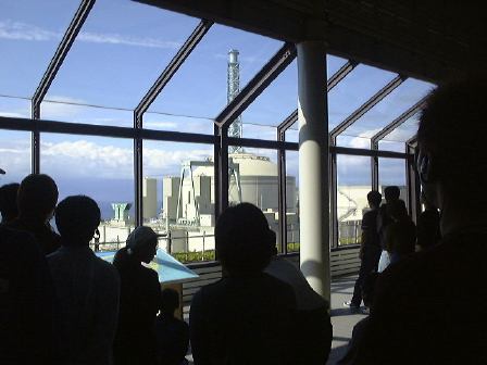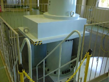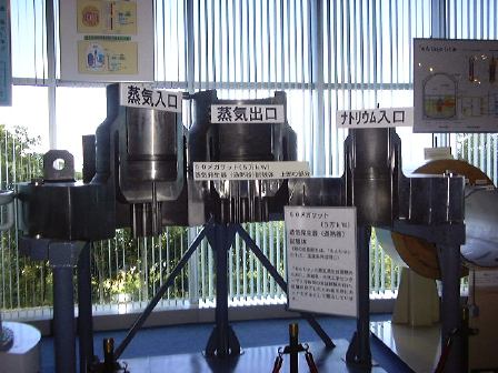 以上のように模型や展示物などの写真ばかりなのは、「もんじゅ」内部では写真撮影が禁止されていると言われたので、それまでにいっぱい撮っておこうと思った結果です(笑)。アメリカのテロ事件以降、原子力施設の警備も強化されているとのことで、バスに乗って「もんじゅ」に向かう道路の途中で軽めの検問を通りました(軽いんかい!)。それからバスで丘を登って、展望台から「もんじゅ」を眺め(これがアップ)、いよいよ内部の見学となりました。金属探知ゲートをくぐり、暗証番号入力が必要な扉を越え(団体入口から入場)、廊下を歩いたり階段を昇ったりして最初に見たのは中央制御室でした。案外入口から近いところにありますね。その次は噂のナトリウム漏えい現場の見学。ここは本来の見学コースではなかったそうですが、事故以来情報公開をして信頼回復のために見せているみたいです(なのでみんなヘルメット着用)。実際に見て説明を聴いた限りでは、漏れたのは2次系(直接原子炉には触れない)のナトリウムで、事故は想定内のことで、それに対する対策もしてあった(当たり前ですが)ようだし、非常事態的に危険があったというわけではないことが解ります。ただ、事故後の対応がまずかったらしく、日本の風土では「もんじゅ」が安全審査に通り再び運転できるようになるまでにはあと5年はかかるだろうとのことでした(ちなみに他の国では半年くらいで再開できるレベルの事故らしい)。まぁ、二度と事故が起きないようにするに越したことはありませんが。最後に、ナトリウムから水への熱交換が行なわれる蒸気発生器の上部部分の見学をして「もんじゅ」を後にしました。エムシースクエアに戻り、職員の方々と別れ、宿泊場所へ向けて出発したのが午後3時頃でした。