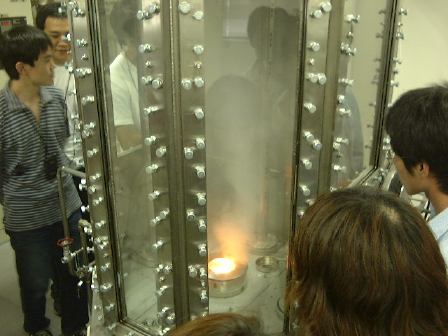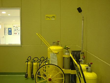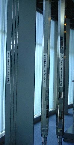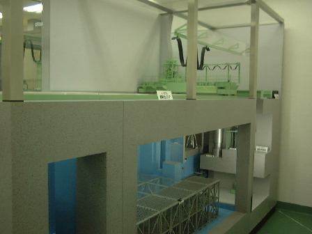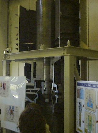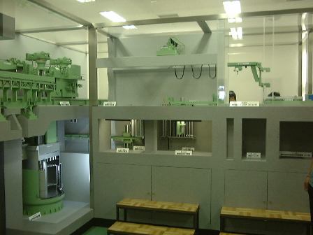 さて続き。現在広く普及している原子力発電は軽水炉型で、ウランが核分裂する時の熱を水を使って冷却し、その結果発生する水蒸気で発電機のタービンを廻す構造をしていますが、「もんじゅ」のような高速増殖炉と呼ばれる型では、水の代わりに液体状の金属ナトリウムを用いて核分裂による熱を伝えて、その熱がさらに外側で循環する水を高圧の水蒸気に変えて、その水蒸気で発電機のタービンを廻す仕組みになっています。このナトリウムが以前漏れたわけですね(ただし2次系なので放射性物質漏れはなし)。で、金属ナトリウムは反応性が高く取扱いに注意を要するため、「もんじゅ」のそばにはナトリウム研修棟が建てられていて、ここでナトリウムの取扱いについての技術などを身につけるようになっているそうです。またすぐ横には保守研修棟も建っていて、そこでは「もんじゅ」の保守点検のための訓練ができるとのこと。ここからの案内は現場で働いている風のおじさんにバトンタッチ。まずはナトリウム研修棟に入り、金属ナトリウムを実際に切ったり、密封したセルの中で燃焼させてみたり、中でナトリウムの消火訓練やナトリウム漏れに対する訓練などができる大きなセル(パノラマ風に)を見たりしました。ちなみにナトリウムの消火には水が使えない(激しく反応するので)ので、専用の黄色いナトレックスという消化剤が置いてあります。どことなく「におわなっとう」に通じるネーミング。ちなみに、納豆が匂うのは発泡スチロール容器に入れるようになったからだということを聞いたような気がします(「美味しんぼ」だったかな)。全然関係ないですが。続いて保守研修棟では、駆動部分がそれぞれ異なる3種類の制御棒が炉心に挿入される(緊急時は重力落下で)一連の流れを手許のパネルで操作できる炉心断面模型や、燃料棒交換の流れを実際の施設同様の流れで見られるようになっている模型(左下が原子炉部分)、その右側部分、そして裏側。別の部屋に移動し、燃料棒交換の研修をするために実物大(建物の関係上高さは縮小)に作られた原子炉交換装置部分や、実験炉「常陽」で実際に使われたナトリウムを循環させるためのポンプ(ナトリウムが空気に触れないようにするために複雑な構造をしている)なども見学しました。
