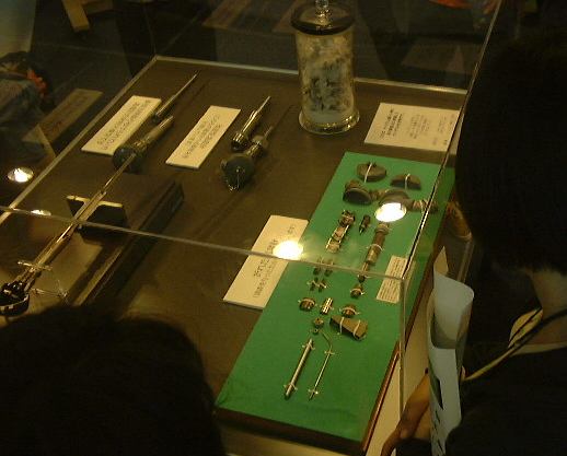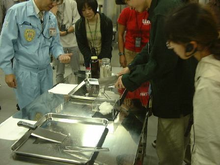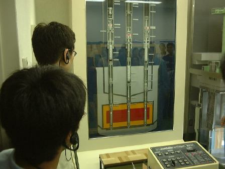 バスに先を越されましたが、12時前には核燃料サイクル機構の「もんじゅ」のそばにあるエムシースクエアという施設に到着。そこの会議室のような部屋に案内され、遅ればせながらみんなと一緒に用意されたお弁当をいただきました。諸注意を聞いた後、12時10分からはいよいよ見学会の開始となりました。まずはエムシースクエア内に展示されているものの見学です。ちなみに「エムシースクエア」とは「もんじゅ」の「M」と「コミュニケーション」の「C」を取って、「もんじゅ」のことを知ってもらう広場(スクエア)という意味が込められているそうで、アインシュタインのエネルギィと質量が等価であるという式「E=mc2(エムシースクエア)」にもかけているそうな(どっちかは後付けでしょうけど)。さて、そこで最初に見たのは「3Dハイビジョンで観るエネルギィ問題ともんじゅ」みたいな感じの数分の映像。立派なホールに入ると座席にはこういったものが用意されていて、この3Dメガネをかけて鑑賞します(ディズニーランド以来か)。中央の箱は記念品のライト付きのボールペン。ホールの前方はこんな感じ。映像の内容は確かに立体的に見えるものでしたが、特に3Dにする必要があるとは思えない内容だった気がします(というか、いかにも3Dにするために撮ったとしか思えない場面さえも見受けられました)。まあ、ちょっとした子供騙しにはなるでしょうけど、なんかその小手先感がお役所的ですね〜。その後は2班に別れて施設内の展示物をお姉さんたちに案内してもらいました。このときからハンディな受信機を首から下げてイヤホンを片耳に装着することになります。これはチャンネルがいくつかあって、班ごとにそれぞれお姉さんの持つ送信機からの信号を受けて遠くからでも説明を間近に聴くことができる代物です。だからチャンネルを変えて別の班のお姉さんの声を聴くこともできます(わ〜いっていうか混乱)。そうやって、1階ではメガネいらずで立体映像が見られるところや、立体的な小さな人が「もんじゅ」の仕組みを案内してくれるマジックビジョンや、「もんじゅ」の25分の1スケール模型や、スケールダウンした蒸気発生器の断面(実際に稼動した試験体はこちら)とか炉心断面とか燃料棒とか、ナトリウム漏えい事故の原因となった破損した温度計部分の説明を次々に受けました。事故があってから、簡単にはセンサ部分が折れることのない改良型の温度計を開発していることが主張されていましたね。2階に上がってみると、今度はナトリウムの温度を管の外から測れる超音波型温度計が展示されていたり、温度計には力が入っている模様。「もんじゅ」に関することを勉強できるパソコンコーナでは20周年記念マックを見つけてしまいましたが、それに触る時間もなくお姉さんによる案内はどんどん進むのです(残念)。あとは、「もんじゅ」が建っている地域のジオラマを見たり、窓から綺麗な海辺を眺めたり、なぜか福井の名産品も見ました(笑)。それからこんなものも発見(プリクラらしい)。エムシースクエアでの見学はここまで。この後バスに乗って移動し、少し離れたところにあるナトリウム取扱研修棟と保守研修棟という施設の見学となりました。