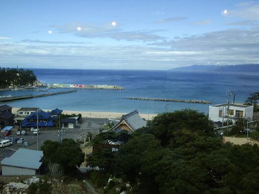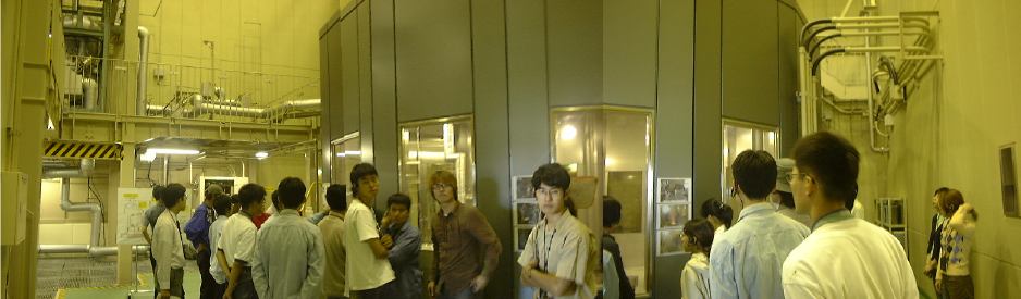 閑話休題。この日は地球惑星科学教室以外の人を対象にした学生主体の学外セミナの1日目。今回のセミナの舞台は福井県です。前夜はその準備をしていて午前3時頃の就寝でしたが、起きたのは午前7時。もっと眠りたい身体に冷たいシャワーを浴びせて8時に大学へ。朝から激しい雨でした。参加者は例年になく1、2年生が多く、バスは補助席まで倒していっぱいっぱいだった模様ですが、雨なのにみんなちゃんと集まってくれたようです(学外セミナ委員の中に風邪をひいて来れなくなった人はいましたが<「天一」に行ったという噂あり<半額セールだから)。予定出発時刻の9時には出発できたと思います。バスはそんな状況なので教官1人と学生4人が公用車のプラドで別行動となりました。まさにそのプラドに乗りっぱの3日間だったので、残念ながらバスの中の様子は知らないので書くことができませんが、往きではそれぞれの自己紹介が行なわれていたようです。第一目的地は敦賀にある高速増殖炉「もんじゅ」。そこまではY田先生がプラドを運転されたのですが、車に乗るのが1年ぶりくらいらしく、高速道路では大雨に降られるし、それはもうドキドキものでした(苦笑)。途中養老サービスエリアで休憩をしてから、再び敦賀に向けて出発。バスの中で自己紹介ができなかったのが心残りですが、もっと心残りなのはバスガイドさんを間近で見れなかったことですね(笑)。車に乗ること2時間半。雨もやがて上がり空には青空が見えてきた頃、我々の視界に飛び込んで来たのは南の海と見紛うかというくらいエメラルドグリーンの海でした。遠浅の海が太陽の光を浴びてとても綺麗です。同乗者のO井君曰く「我々の汚い心が洗われるかのような景色じゃないですか?」。