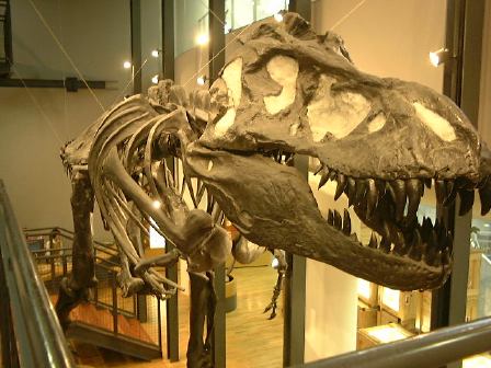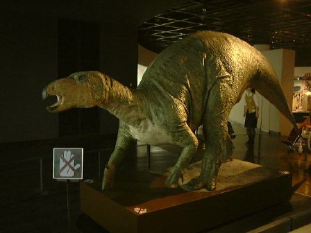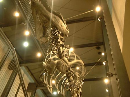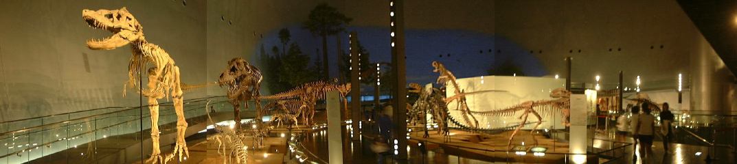 昨夜のお酒がもろに効いた人がいて一部プラドに乗るメンバの交代がありました。しかし、出発して間もなく1人がリバース(苦笑)。ちゃんと袋にしてましたから助かりましたが、先が思い遣られます。この日の目的地は勝山市にある福井県立恐竜博物館。そこまでは山道を通って行ったのですが、到着間近になって再び二日酔いの人々の周期がやってきました。途中に運良くあった休憩所(チェーンの脱着場)のトイレで二人が戻すという惨状(お食事中の方すみません)。普通の用も含めて小雨の降る中しばらく休憩となりました。その後、2日目から合流のO野氏を今は脱線事故の影響で走っていない京福電鉄(代行バスが出ている)の勝山駅に迎えに行き、バス組に遅れること数十分で博物館に到着。遠くからでも卵型の巨大なドームが目立つ建物です。入口側はこんな感じで、正面には恐竜の形をしたモニュメントがある噴水。中に入ってみるとこんなエントランスホールが見渡せます。下から見るとこんな感じでなかなかユニーク。観賞順路としてはこのエスカレータを下って地下1階から見て行く形になります。建物はどこもかしこも綺麗で、お金がかかっているなあという印象。福井県が恐竜に賭ける意気込みが伝わってくるようです(笑)。しかし、残念ながら展示物の撮影は制限されているので写真は少ししかお見せできません。まず観賞したのは、博物館1周年記念特別展の「ロイヤル・ティレル古生物学博物館の恐竜たち」。ここではずっと以前に大阪であった恐竜大博覧会で見たことのあるティラノサウルス・レックスの全身化石「ブラック・ビューティ」にも再会することができて少し感慨深ゲでした。その出口付近で売っていた恐竜のぬいぐるみが欲しかったのですが、時間がなくて結局買えず。その後、常設展示をほぼ順路通りに観賞しました。撮影OKポイントから見た卵型ドーム内部はこんなふう。大型恐竜の展示が結構多い感じです。あと、恐竜のみならず、地球の誕生から進化、人間の出現までの生物進化の流れも化石や標本などを使って展示されていて見どころ満載です。中でも岩石標本の展示スペースは展示方法が新しくて面白かったでしょうか(恐竜とは直接関係ないのですが)。昼食は各自館内のレストランで用意されたお弁当をいただきました。そのレストランから見た卵型ドーム。昼食後入ったダイノラボというスペースにはティラノサウルスの全身骨格が展示されており、本物の化石も含めていろいろ触れるようになっていました。上から、正面から、斜め前から、そして下からのティラノサウルス。それから2階部分のドーム入口には動くフクイリュウが展示されていました。あっと言う間に集合時間となり、恐竜博物館を後にしなければいけなくなりました。流して観ても充分楽しめたし、じっくり観賞すればもっと面白いだろうなと思われるところでしたね。