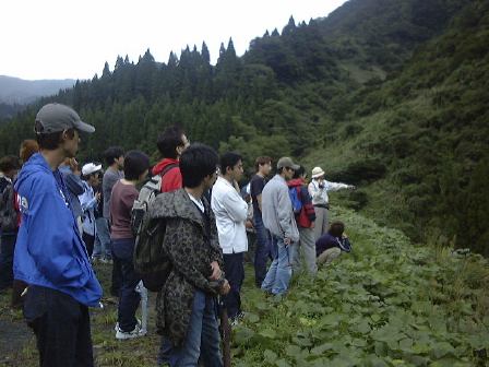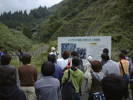 次は博物館の学芸員の方の案内で、恐竜化石が多く発掘されている発掘現場の見学です。地質帯でいうと手取層群と呼ばれる地層にあたります。バス組のみんなは途中、例のチェーン脱着場で小さなバスに乗り換え、発掘現場へ続く林道入口までピストン輸送されました。曇り空の下、降り注ぐ西日に照らされる待っている人々を一枚。振り返ると絵になる景色。やがて全員が揃ったところで発掘現場へ向けて出発。林道を下ったり登ったりしながら15分くらい進むと視界が開けました。そこは川が流れている谷で、秘密の場所だと聞いていましたが、でかでかと大きな看板に書いてあります(笑)。それを前にして説明を受け、山を削り取った際の岩石などを積み上げて作られた左手に見える(もちろん「左手に似ている」という意味ではない)ちょっとした丘の上に登りました。その上からは正面に発掘現場が見えます。水たまりの左側には恐竜の足跡化石が見つかったそうですが、今は保存のために埋め戻してシートをかぶせてあるそうです(その上に草が侵攻している)。などなどの説明を受ける様子。そしていよいよ、その場での化石探しが始まりました。ただし、ハンマーで叩いて良いけど見つけた化石は持って帰っちゃダメという制限付き。方々に散ってぐるりと化石探しをしたのは10分くらいだったでしょうか。結局誰も動物の化石を見つけることはできず、長い道のりをまた引き返し、バスは宿泊場所へと向かったのでした。後のアンケート結果によると、残念ながらここはイマイチつまらなかった場所になったようですね(ふむ〜)。