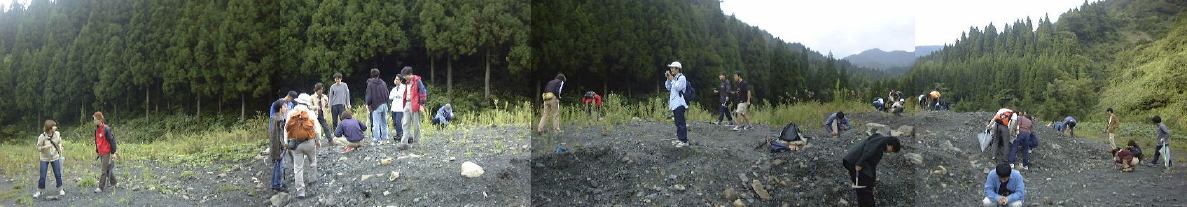 (10/4) 今日は朝から地化図サンプリングの1日でした。沢や川に入って、河川堆積物をフルイにかけ、細かな粒子のみを採取するというお馴染みの作業です。お金がもらえるアルバイトなので文句は言えませんが、半強制的に参加したような感が否めないのは何だかなあ・・。この日に地化図のサンプリングをやるということを聞いたのは学外セミナへ行く前日だったと思います。そんな直前で言われても・・というのが正直な感想でしたが、人数が集まらなさそうだし参加したしだいです。しかし、せめて2週間くらい前に通達して欲しいと思うことしきり。何と言うか、人の良心に付け込んでいるとしか思えません。学生に甘えているとも言えます。いつまでもみんながやってくれると思っていてはいけませんよ(これは誰に向けた発言?)。と愚痴をこぼすのはこれくらいにしておいて、今回のサンプリング場所は土岐市です。高速道路を使って名古屋から土岐まで行き、そこから少し北上したところがフィールドです。T中先生の運転するプラド号と、M先生の運転するカローラ号の2台の車に、2人ひと組の班(先生含む)が2班ずつ乗り込み、朝9時過ぎに大学から出発しました。
