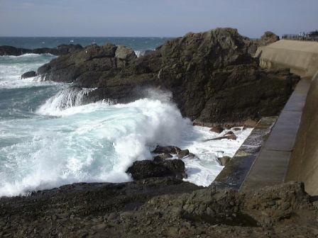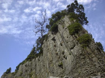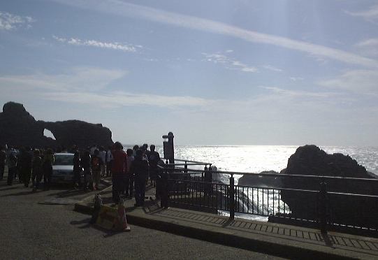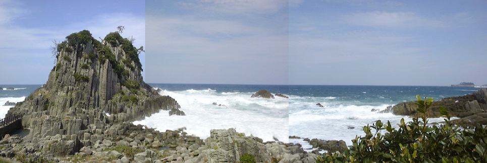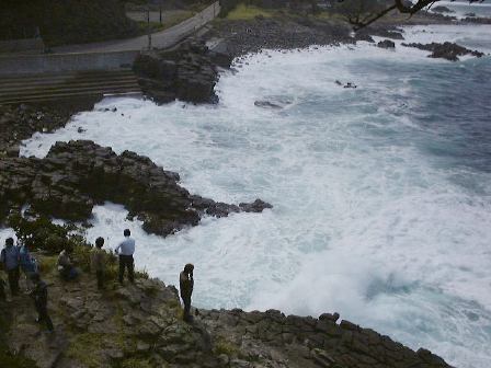 その後、呼鳴門というところまで移動して(依然として越前海岸)そこにある京福電鉄直営のレストランで昼食をいただきました。海が近いせいか刺身にフライに焼きものすべてにおいて海の幸で、さすがに新鮮で結構美味しかったです。昼食後、外に出てここら一帯にある礫岩層の説明を受け、西日を浴びながら露頭側に集まってここでも記念撮影。この頃が風が最高に強くて、海岸に打ち寄せる波も絶好調でした(この季節には珍しいことだとか)。波が狭い岩石の隙間に入って上方に一気に海水を吹出す潮吹き岩があることで有名なところみたいですが、このときも轟音とともに激しく吹き上がっていましたね。露頭では波があまりにも激しいため、多くの人が岩石どころではなく崖を覗き込んだり、打ち寄せる波を見続けていてばかりでしたね(笑)。まぁ結果的には面白かったのでそれはそれで良いのですが、ちゃんと岩石の写真も撮っていてこんな礫岩が見られます(あ、スケールを置くの忘れてる)。ちなみにこれが噂の激しい波です。